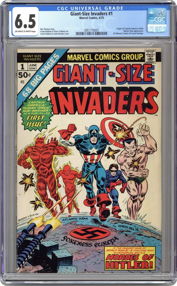 Ended Nov 22 2022 Winning Bid $30 "The Coming of the Invaders!" Written by Roy Thomas. Art by Frank Robbins and Vince Colletta. Long before the Avengers, there were the Invaders. Captain America, the world's first super soldier, Prince Namor, the world's first mutant, and the Human Torch, the world's first android, and their sidekicks Bucky and Toro to form the Invaders. The greatest heroes of the Golden Age unite to win World War II and take down the Axis Powers once and for all. Their first mission: the Invaders race against the clock to save the Prime Minister of the United Kingdom, Winston Churchill, from an assassination plot. NOTE: 1st appearance of Master Man. 68 pages, FC. Cover price $0.50. Grade: CGC 6.5 explanation of grade Condition: Used (collectible)