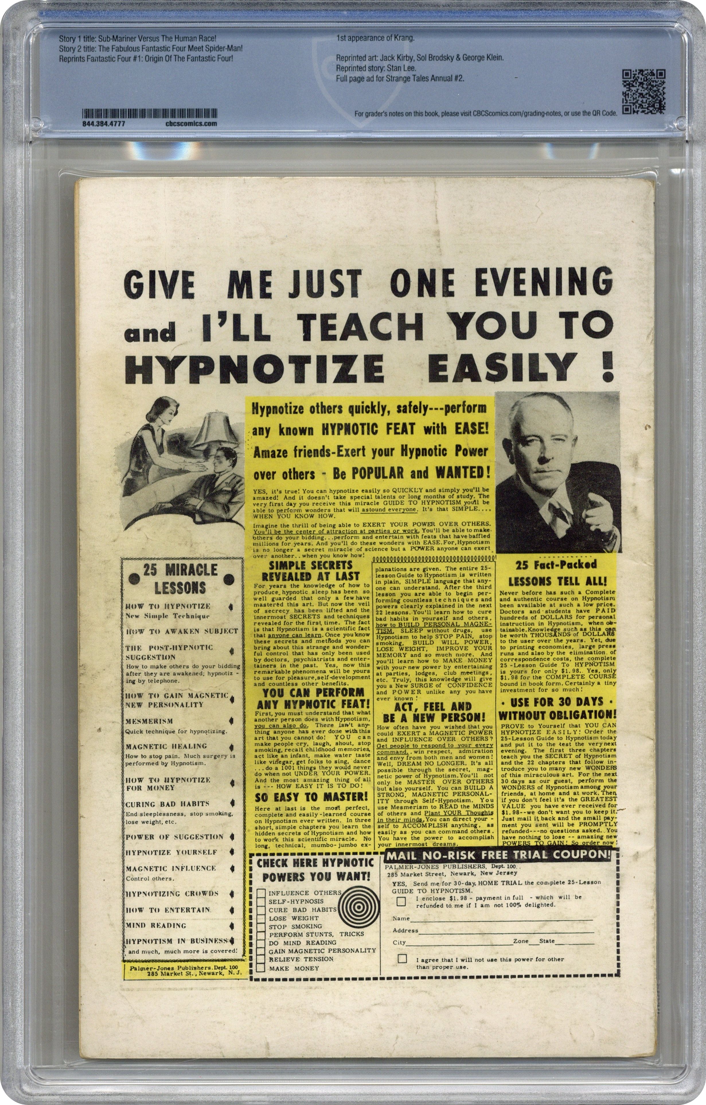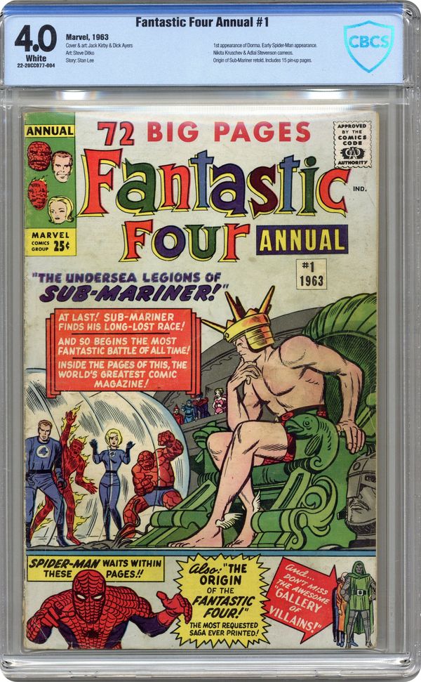 Ended Oct 12 2023 Winning Bid $226 New Sub-Mariner/FF story: "Sub-Mariner Versus the Human Race!" Script by Stan Lee; pencils by Jack Kirby; inks by Dick Ayers. New Spider-Man/FF story: "The Fabulous Fantastic Four Meet Spider-Man!" Script by Stan Lee; pencils by Kirby; inks by Steve Ditko. Fourteen pages new pin-ups and special features by Kirby/Sol Brodsky. Thirteen-page Fantastic Four origin reprinted from FF #1 76 pgs. Cover price $0.25. Grade: CBCS 4.0 explanation of grade Condition: Used (collectible)