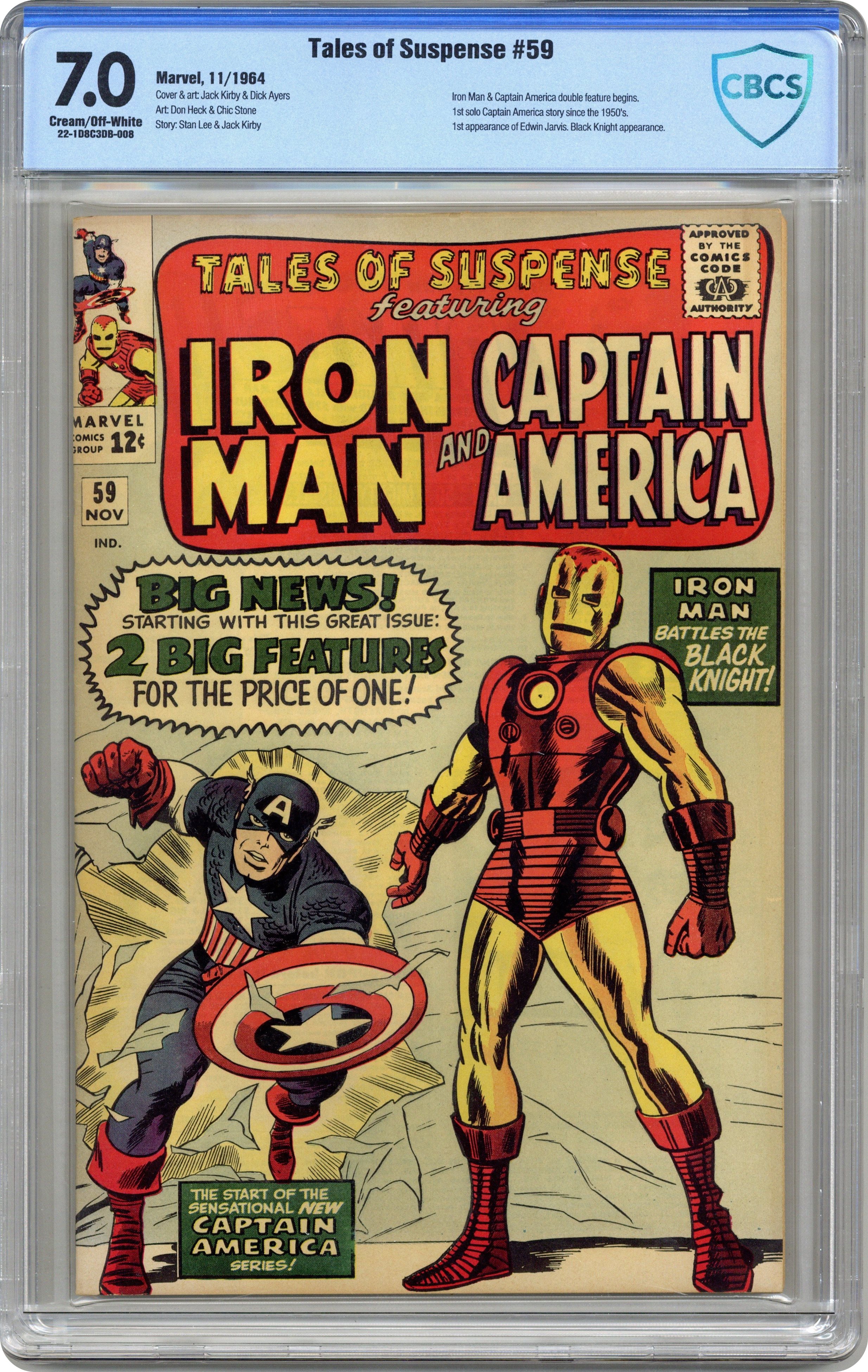 Ended Jul 13 2023 Winning Bid $280 Cover pencils by Jack Kirby, inks by Dick Ayers. Iron Man and Captain America double feature begins. The Avengers guest star in the Iron Man story, "The Black Knight," script by Stan Lee, pencils by Don Heck, inks by Chic Stone; Iron Man battles the Black Knight; Wasp, Giant-Man, Captain America, and Thor appear. Part of the story continues in "Captain America," the first Silver Age Captain America solo story, script by Stan Lee and Jack Kirby (co-plot), pencils by Jack Kirby, inks by Chic Stone; While Cap lounges around Avengers Mansion, thinking about Bucky and his place in the world, a gang of costumed thugs break in intent on stealing any secrets or weapons Stark may have lying about the place, to sell for profit; They figure Cap's "just an acrobat"; Bucky Barnes cameo; First appearance of Jarvis (the Avengers' butler). Letters page begins. 36 pages, full color. Cover price $0.12. Grade: CBCS 7.0 explanation of grade Condition: Used (collectible)