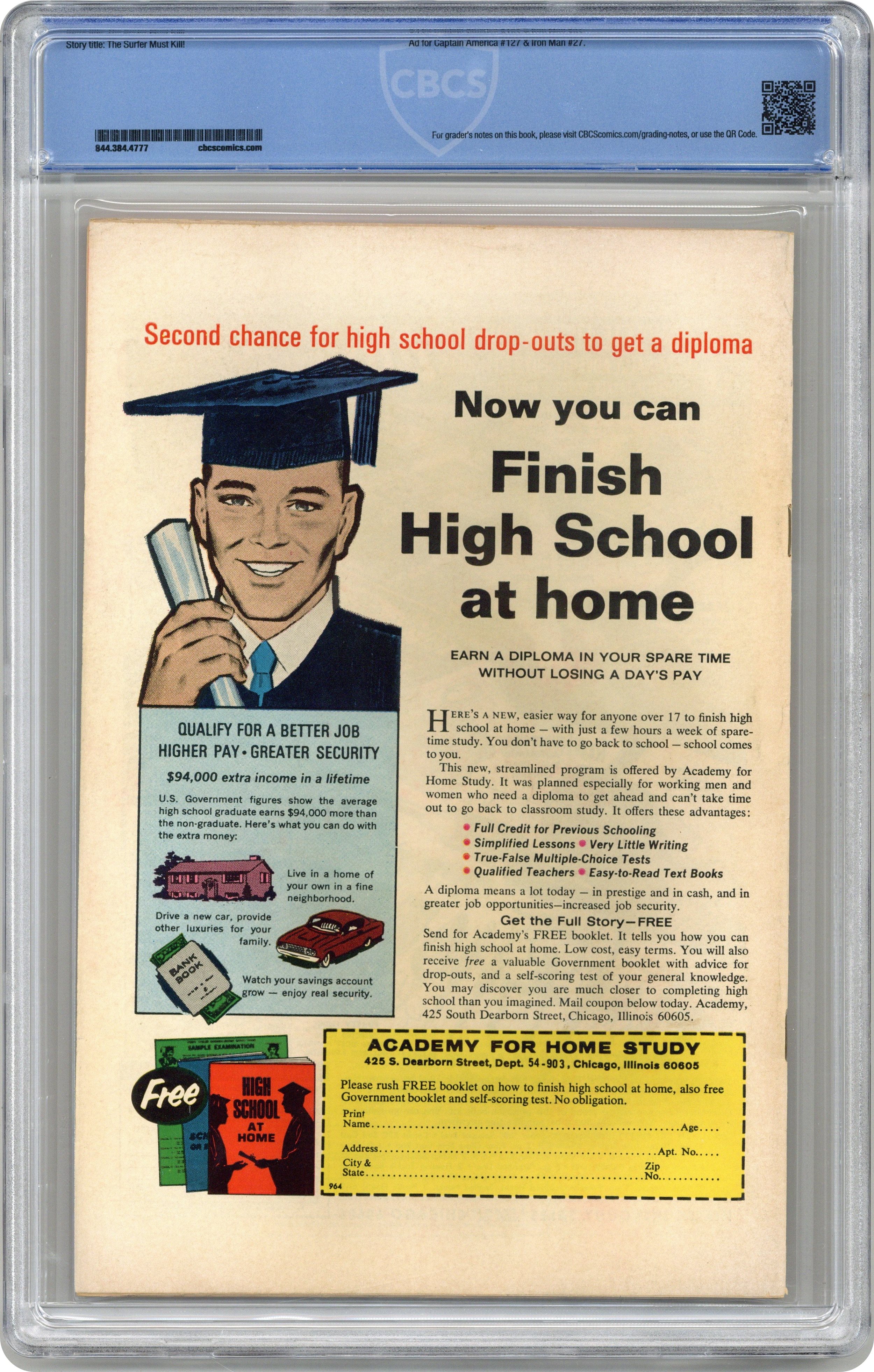 Ended Jul 2 2024 Winning Bid $50 Mephisto and Nick Fury guest star in "The Surfer Must Kill!" Script by Stan Lee, pencils by John Buscema, inks by Chic Stone. Brief Fantastic Four appearance. Barry Windsor-Smith cover pencils. Cover price $0.15. Grade: CBCS 5.5 explanation of grade Condition: Used (collectible)
