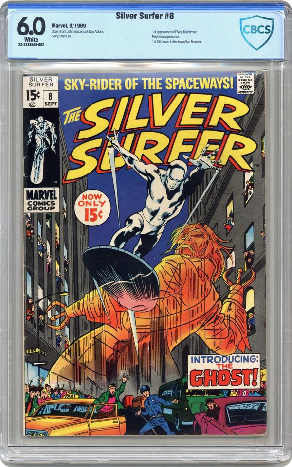 Ended Jul 2 2024 Winning Bid $48 "Now Strikes the Ghost!" Part 1 of 2. Written by Stan Lee. Art by John Buscema and Dan Adkins. Mephisto, the very embodiment of evil, sends a powerful emissary, The Flying Dutchman, to destroy his hated enemy, the Silver Surfer. Cover price $0.15. Grade: CBCS 6.0 explanation of grade Condition: Used (collectible)