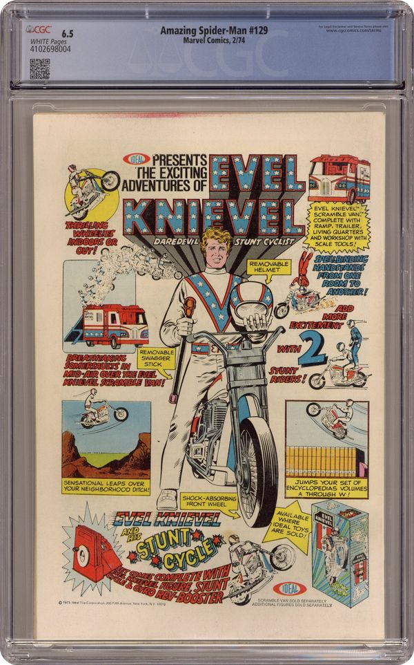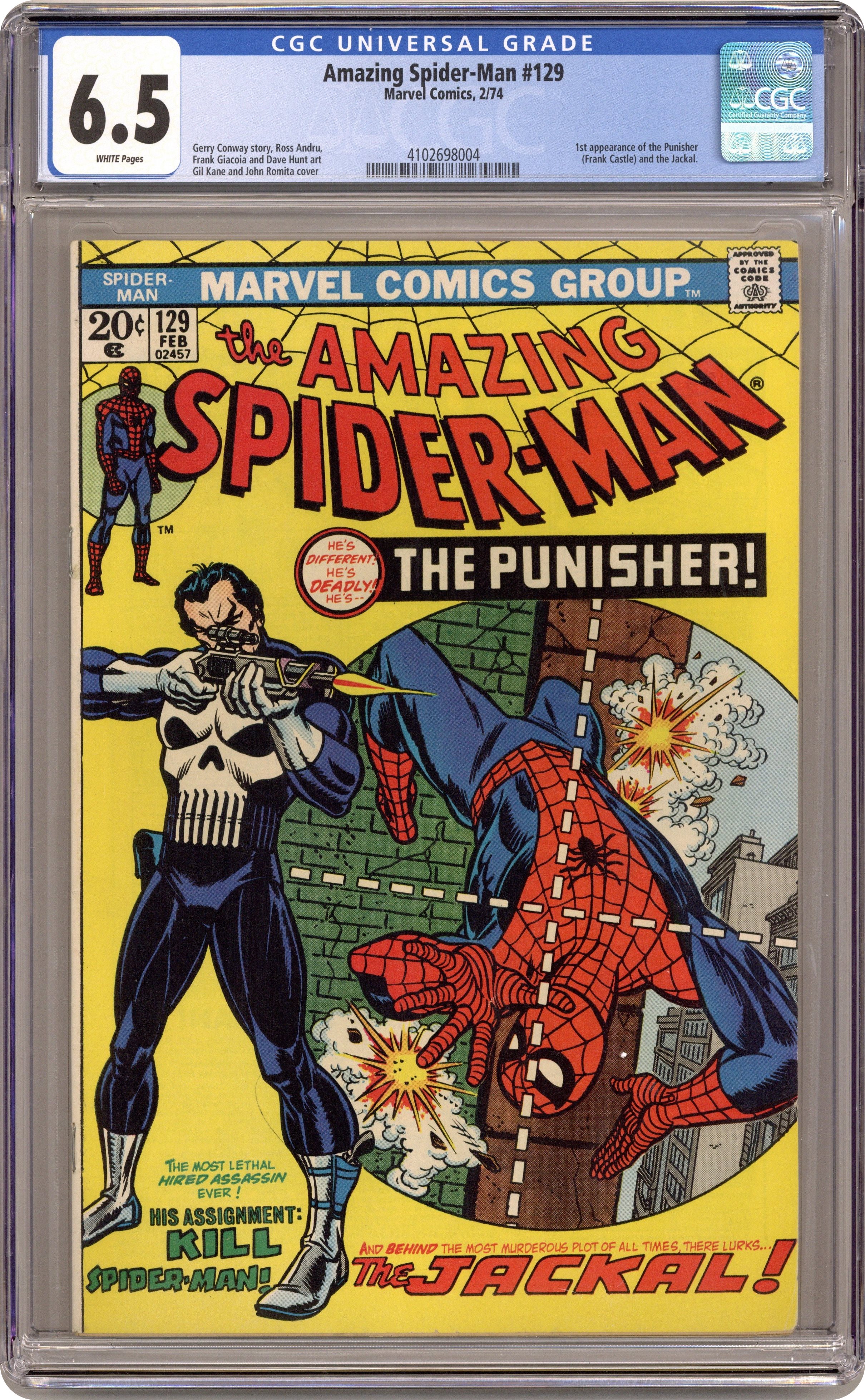 First appearances of the Punisher and the Jackal in "The Punisher Strikes Twice!" Script by Gerry Conway. Pencils by Ross Andru. Inks by Frank Giacoia and Dave Hunt (backgrounds). Cover by Gil Kane and John Romita. One of the landmark issues of the bronze age! The Punisher, the legendary gun-toting vigilante, makes his first appearance in the Marvel Universe! And his first target...is none other than your friendly neighborhood Spider-Man! But before Frank Castle can locate the web-slinger, he needs directions from a mysterious new super-villain called the Jackal! Once the dastardly Jackal tells the sharpshooting anti-hero where to find the wall-crawler, the inaugural battle between the Punisher and the Amazing Spider-Man erupts! The first of many classic confrontations! Cameo appearances by Mary Jane Watson, Harry Osborn, Betty Brant, Joe Robertson, and J. Jonah Jameson. (Notes: The Punisher appears next in Amazing Spider-Man 134 (cameo) and 135. The letters page includes a letter from comics writer Ralph Macchio. This story was reprinted in Marvel Tales 106 and again in Marvel Tales 209.) 36 pages. 20 cent cover price. Cover price $0.20. Grade: CGC 6.5 explanation of grade Condition: Used (collectible)