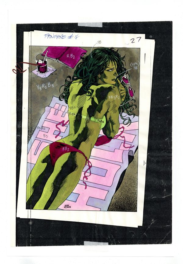 Original Color Guide from Marvel Fanfare #18 (1984), Page 27 by Kevin Nowlan. Credited by John Byrne as the inspiration for the story in Fantastic Four #275 in which Shulkie must track down some paparazzi who took pictures of her sunbathing on the roof of the Baxter Building, this alluring pin-up is a prime example of what makes Nowlan one of the great comic artists of our time. Watercolor on paper over printed linework, affixed with tape to a larger sheet of paper. Art measures 8 1/2" x 11 3/4", larger sheet of paper measures 8 3/4" x 13", full color.