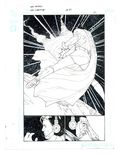 Original Art from JSA Classified #31 (2007), Page 20 Pencils and Inks by Alex Sanchez. Having breached the secret Nazi moon base and splattered the still-alive (and still evil!) brain of Heinrich Himmler all over the wall, the JSA still needs an assist from the Man of Steel in stopping a projectile fired at earth. This stunning 4/5 splash page is pure Superman- a powerful pose, a super punch, and earth in the background with Superman giving Mr. Terrific the all-clear in two small panels at the bottom. Pencil and ink on DC Comics art board. 8 1/2" x 11 1/2", B&W.