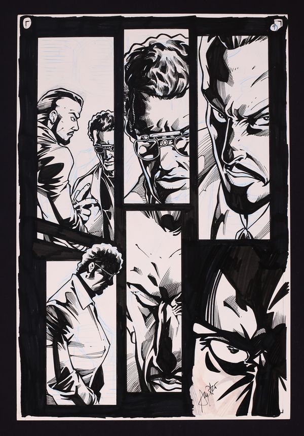Original Art from killer7 #1 (2006), Page 9 Pencils and Inks by Bong Dazo. The comic adaptation of Suda51's groundbreaking and ultra stylish video game brings all of the atmosphere and attitude of the game to the page. This bold panel page shows a tense meeting between assassins. Signed by Dazo in last panel. Pencil and ink on art board. 10" x 15 3/4", B&W.