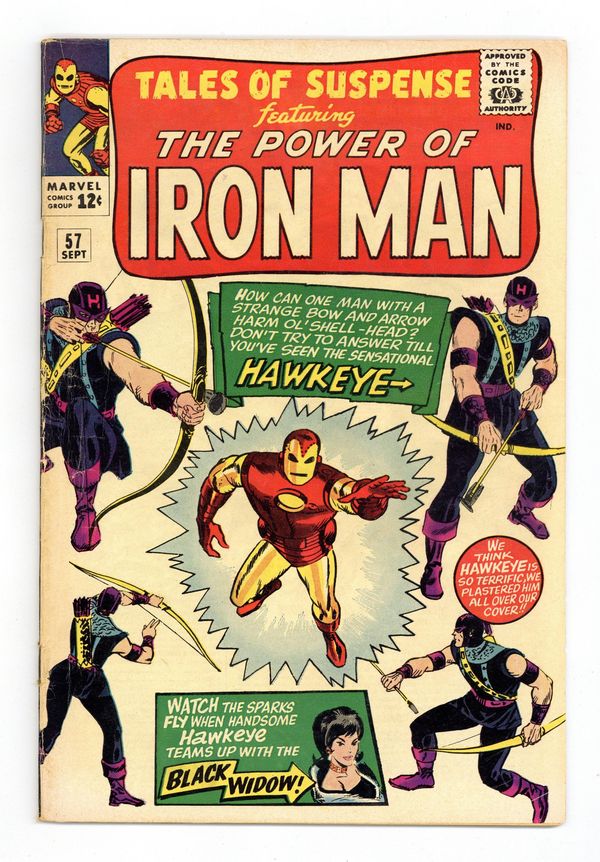 Cover by Don Heck. First appearance of Hawkeye in "Hawkeye, the Marksman!", script by Stan Lee, art by Don Heck; A carnival marksman tries to become a super-hero, but after a misunderstanding with the police he falls in with the Black Widow; Hawkeye attacks Iron Man at the Widow's request, but when he accidentally injures his partner in the fight he flees to get her to safety. "The Runner" text story. "The Watcher's Power!", script by Stan Lee (plot) and Larry Lieber (script), pencils by Larry Lieber, inks by George Roussos (as George Bell); Space Pirates plan to attack a rich planet, thinking the Watcher will not interfere; They are destroyed because they unknowingly targeted the Watcher's home world, the one planet that he can interfere with. 36 pages, full color. Cover price $0.12. Grade: VG 4.0 explanation of grade Condition: Used (collectible)