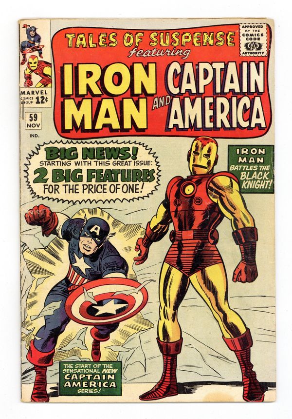 Cover pencils by Jack Kirby, inks by Dick Ayers. Iron Man and Captain America double feature begins. The Avengers guest star in the Iron Man story, "The Black Knight," script by Stan Lee, pencils by Don Heck, inks by Chic Stone; Iron Man battles the Black Knight; Wasp, Giant-Man, Captain America, and Thor appear. Part of the story continues in "Captain America," the first Silver Age Captain America solo story, script by Stan Lee and Jack Kirby (co-plot), pencils by Jack Kirby, inks by Chic Stone; While Cap lounges around Avengers Mansion, thinking about Bucky and his place in the world, a gang of costumed thugs break in intent on stealing any secrets or weapons Stark may have lying about the place, to sell for profit; They figure Cap's "just an acrobat"; Bucky Barnes cameo; First appearance of Jarvis (the Avengers' butler). Letters page begins. 36 pages, full color. Cover price $0.12. Grade: GD+ 2.5 explanation of grade Condition: Used (collectible)