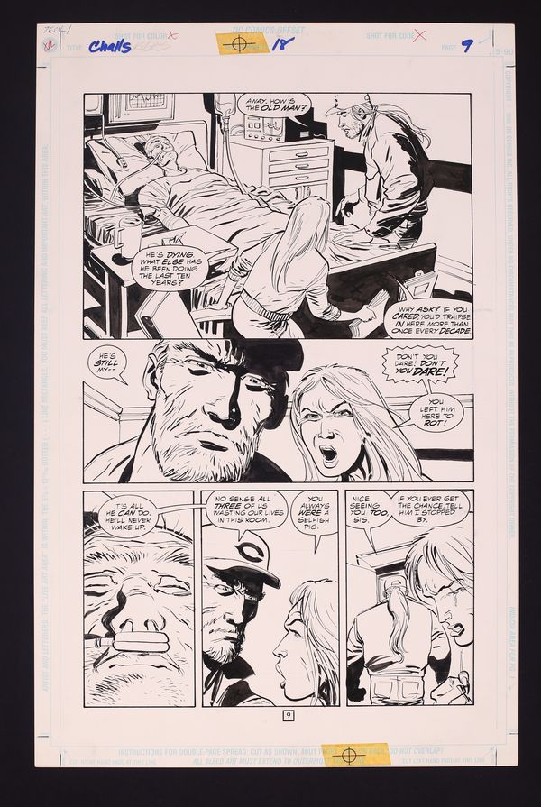Original Art from Challengers of the Unknown #18 (1998), Page 9 Pencils by Mike Zeck, Inks by Denis Rodier. Noel Saxon, the 'Anti-Challenger' who believes the unknown should stay unknown, has returned to earth and has a frosty reunion with his sister and dying father in this dramatic panel page. Pencil and ink on DC Comics art board. 11" x 17", B&W.