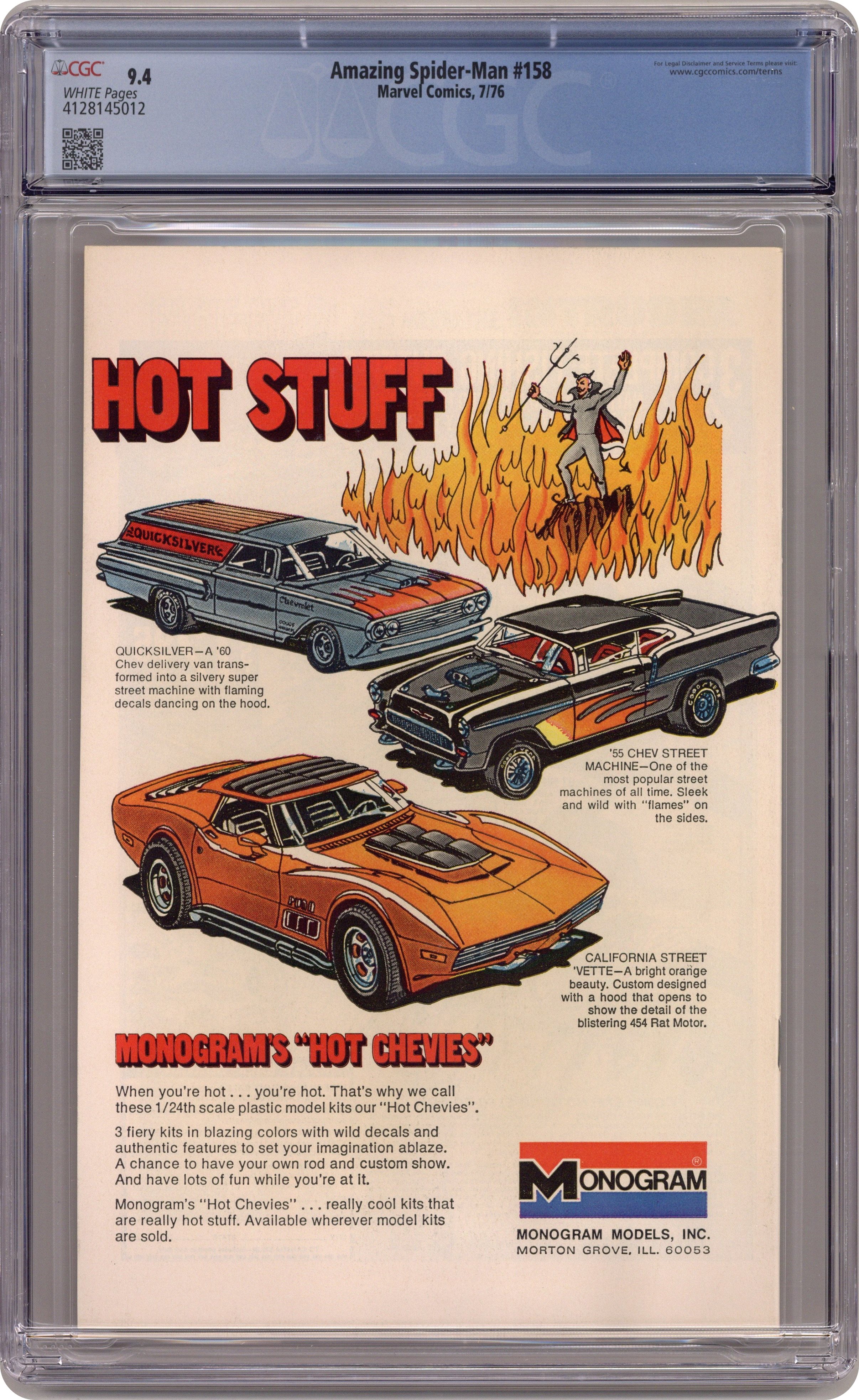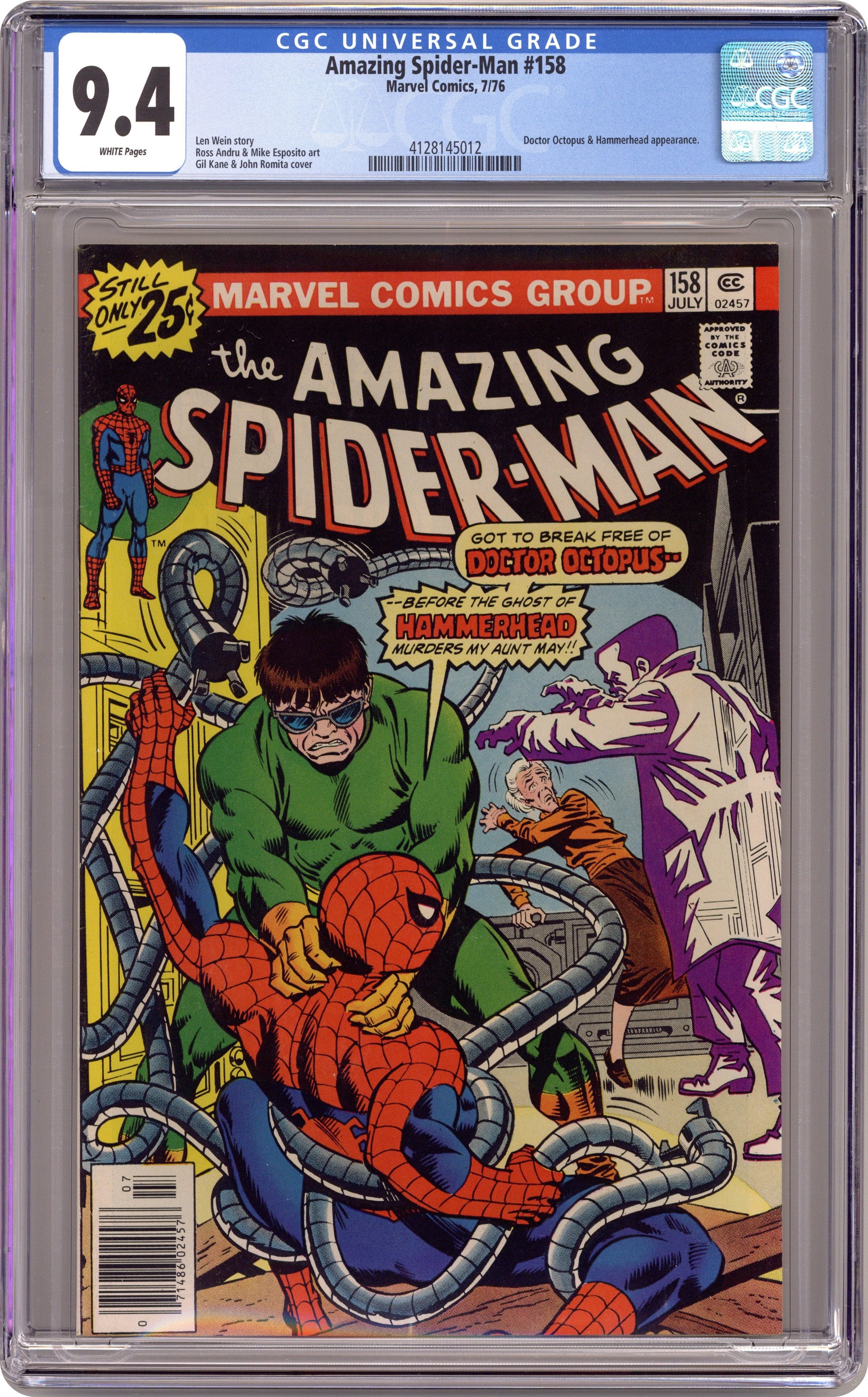 "Hammerhead is Out!" Part 2 of 3. Script by Len Wein. Pencils by Ross Andru. Inks by Mike Esposito. Cover by Ross Andru and Frank Giacoia. After surviving his free fall from the helicopter, the wondrous wall-crawler continues his pursuit of Dr. Octopus and Aunt May! The six-armed super-villain takes refuge at Brookhaven National Laboratory to draw Hammerhead's ghost into a deadly trap! But the sudden arrival of the web-slinger throws off Doc Ock's plan! Instead of destroying the ghost, Octopus' equipment returns Hammerhead to flesh and blood! And that sets the stage for the next issue's three-sided tussle: Doctor Octopus vs. Hammerhead vs. your friendly neighborhood Spider-Man! Cameo appearances by Mary Jane Watson, Glory Grant, Joe Robertson, and J. Jonah Jameson. (Notes: This issue contains a full-page ad for Hostess Twinkies featuring Captain America vs. the Red Skull. This story was reprinted in Marvel Tales 135. A 30-cent cover price variant exists for this issue.) 36 pages. Cover price $0.25. Grade: CGC 9.4 explanation of grade Condition: Used (collectible)