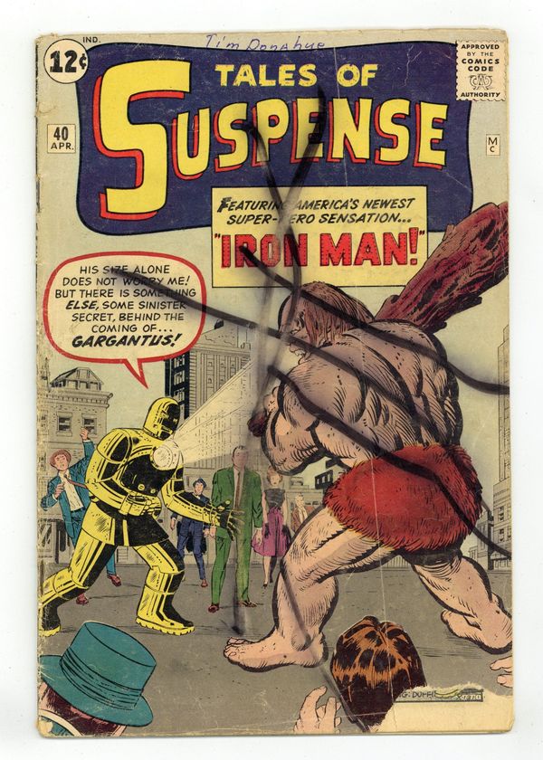 Cover pencils by Jack Kirby, inks by Don Heck. Second appearance of Iron Man in "Iron Man versus Gargantus!", script by Stan Lee (plot) and Robert Bernstein (as R. Berns) (script), pencils by Jack Kirby, inks by Don Heck; Introduction and origin of Gargantus. "Wrong Number" text story. "Work of Art!", script by Stan Lee (plot) and Larry Lieber (script), pencils by Larry Lieber, inks by Sol Brodsky; An unsuccessful artist tries to force a new painter to show him how to paint lifelike pictures; The painter is a sorcerer, and traps the artist in one of his paintings, the secret to his realism. "Prophet of Doom!", script by Stan Lee, art by Steve Ditko; A man from the future arrives in the present day in order to set himself up as ruler; He attempts to extort 100 million dollars from the Secretary General of the United Nations only to be shocked when the Secretary reveals that he too is from the future and that there are agents planted in every era in order to apprehend criminals who may attempt to alter the course of events. 36 pages, full color. Cover price $0.12. Grade: FR 1.0 explanation of grade Condition: Used (collectible)