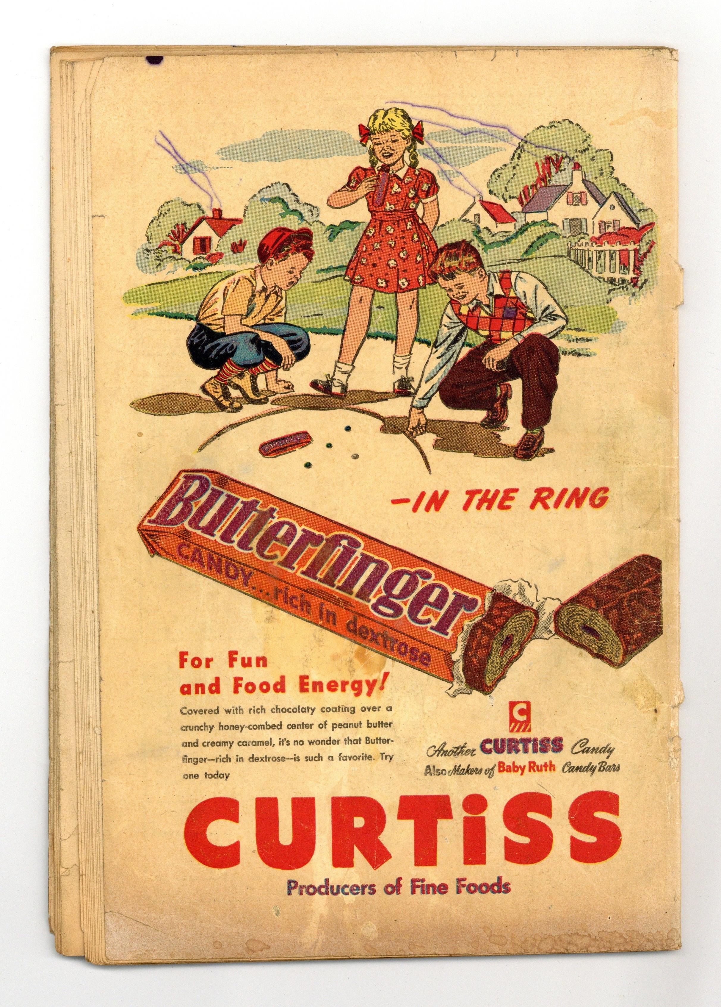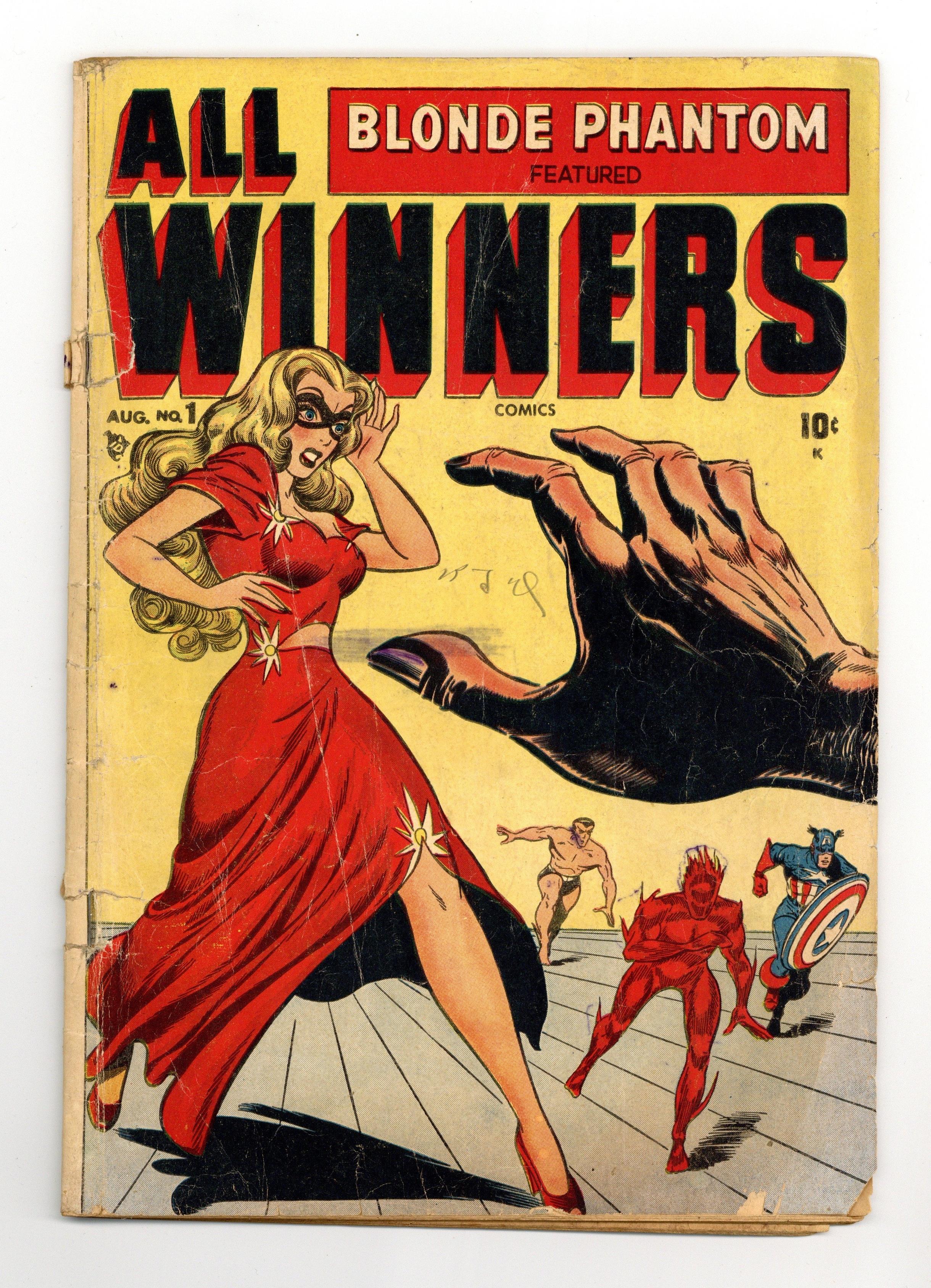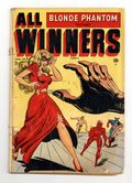 This is the #1 from 1948 (2nd series) of All Winners, which becomes All Western Winners with # 2. Captain America and Bucky star in "Double Identity!" The Human Torch in "Gay Blade of Terror!" The Sub-Mariner in "Murder at Marlin Mansion!" The Blonde Phantom in "Personal Appearance for Murder!" One-page Tootsie Roll ad, "Captain Tootsie Tames a Tornado" (by C.C. Beck). Cover price $0.10. Grade: GD- 1.8 explanation of grade Condition: Used (collectible)
