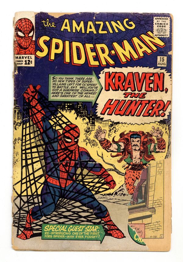 Cover art by Steve Ditko. First appearance of Kraven the Hunter in Kraven the Hunter!, script by Stan Lee, art by Steve Ditko; The Chameleon hires his old friend Kraven the Hunter to hunt down Spider-Man. Reprinted in Marvel Tales # 10 and 153. 36 pgs. $0.12. Cover price $0.12. Grade: PR 0.5 explanation of grade Condition: Used (collectible)