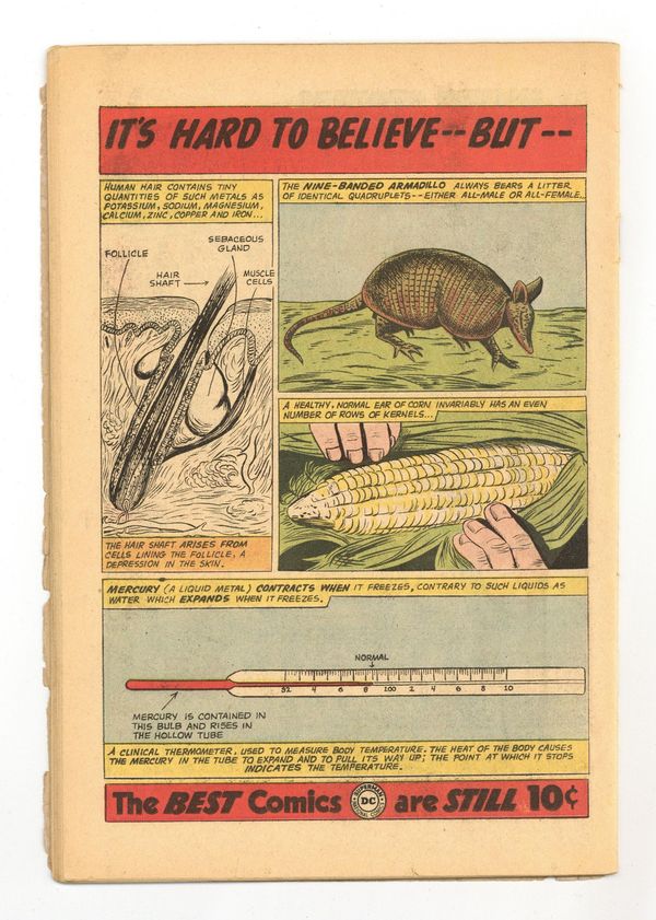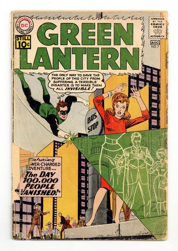 Origin and first appearance of Sinestro. Cover pencils by Gil Kane, inks by Joe Giella. The Day 100,000 People Vanished!, script by John Broome, pencils by Gil Kane, inks by Joe Giella; In an attempt to capture Green Lantern, Sinestro captures 100,000 people from the town of Valdale; The Guardians warn Green Lantern of Sinestro's plan and Green Lantern travels to Qward to rescue the citizens of Valdale. Wings of Destiny!, script by John Broome, pencils by Gil Kane, inks by Joe Giella; Green Lantern accidentally changes Pieface into a bird while Green Lantern is having a dream. Later Green Lantern has to meet Terga at the airport and stop a hijacking. 36 pgs. $0.10. Cover price $0.10. Grade: PR 0.5 explanation of grade Condition: Used (collectible)