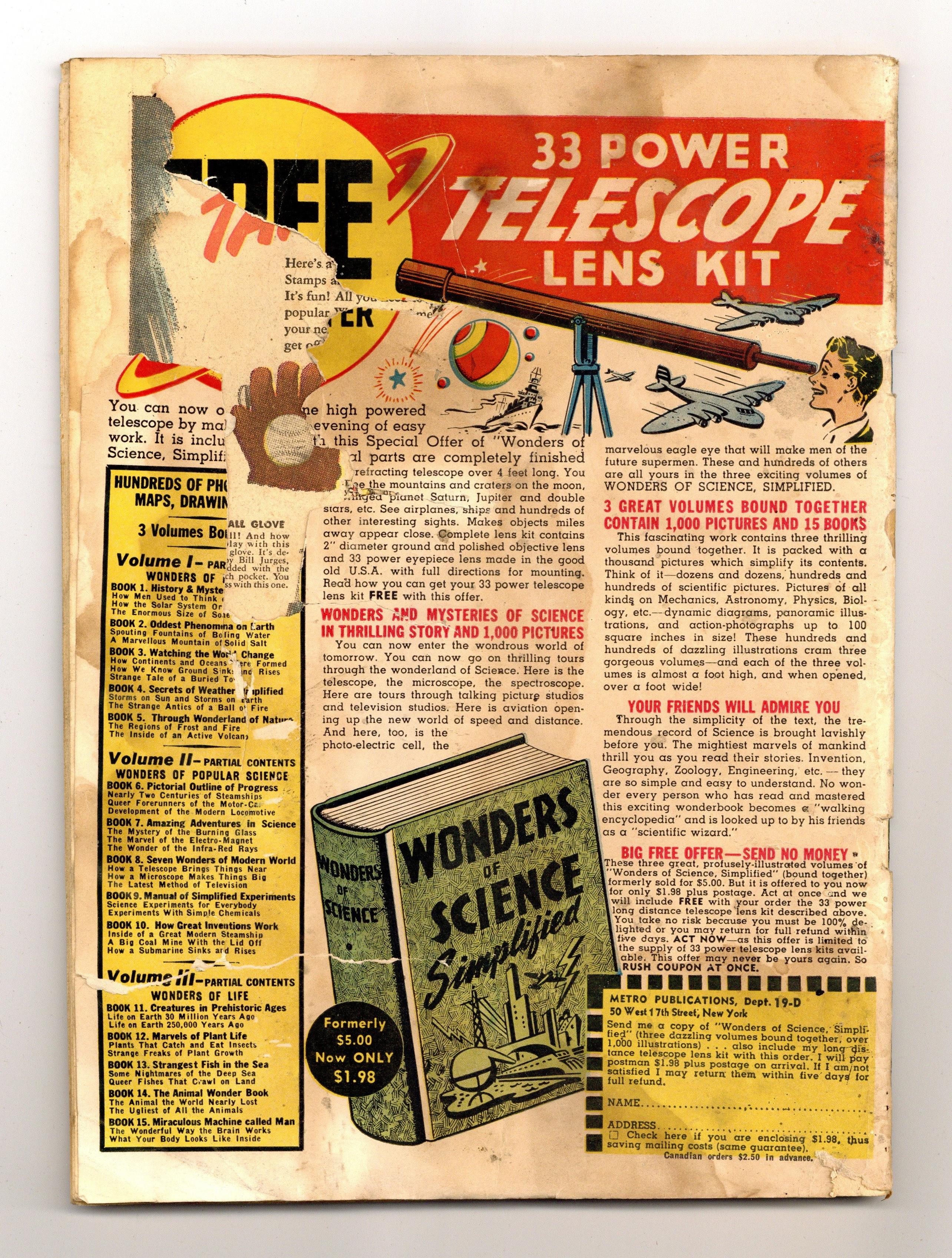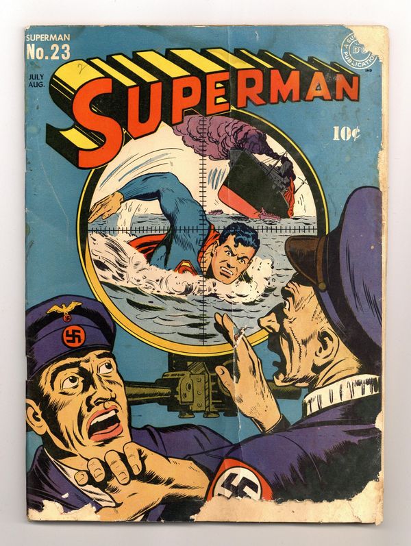 Cover art by Jack Burnley. America's Secret Weapon!, script by Don Cameron [as Jerry Siegel], pencils by Sam Citron [as Joe Shuster], inks by Sam Citron [as Joe Shuster]; When Superman arrives at Camp Towne to make an appearance, he volunteers to participate in the war games that will take place. A Claw For a Clue text story by Tex Raines. Habitual Homicide, script by Jerry Siegel, art by George Roussos [as Joe Shuster]; When Professor Lock makes a move on one of the college girls and is rebuffed, he swears revenge by killing the college dean and blaming her fiance. Hank the Yank humor page by Ray Houlihan. Fashions In Crime starring Superman, script by Jerry Siegel, art by Peter Riss [as Joe Shuster]. Clancy the Cop humor page by Henry Boltinoff. Danger On the Diamond starring Superman, script by Jerry Siegel, art by John Sikela [as Joe Shuster]. 60 Pages, Full Color. Cover price $0.10. Grade: FR 1.0 explanation of grade Condition: Used (collectible)