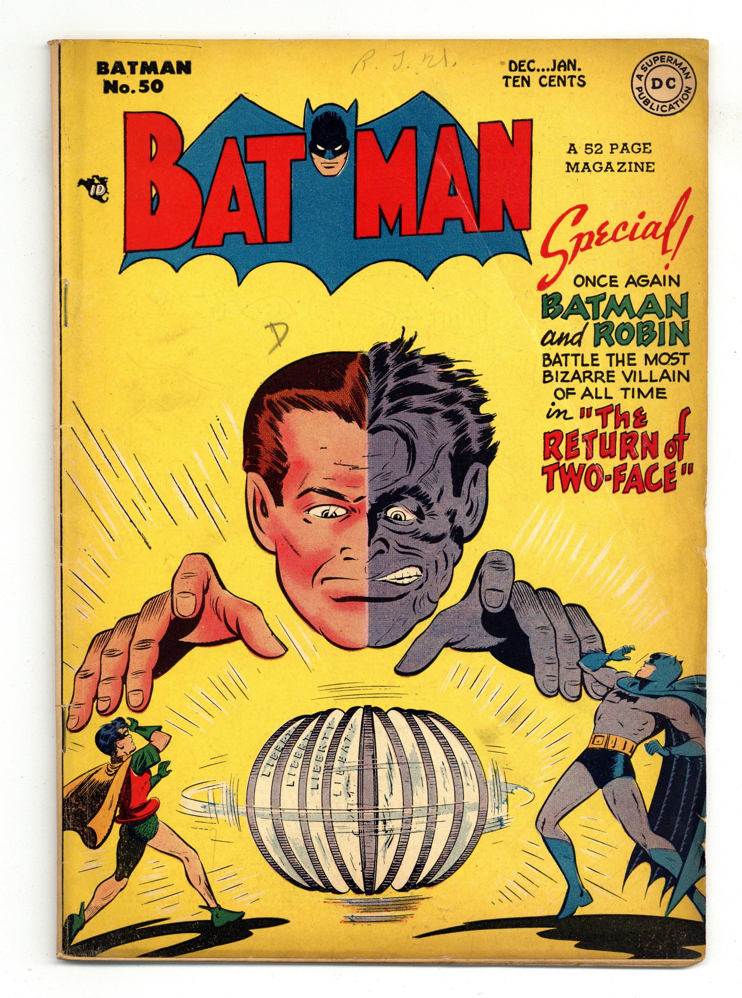 Cover pencils by Bob Kane, inks by Charles Paris. Lights--Camera--Crime!, pencils by Bob Kane (Batman & Robin figures only) and Lew Sayre Schwartz, inks by Charles Paris; Batman and Robin battle the Joker. The Return of Two-Face!, script by Bill Finger, pencils by Bob Kane (Batman & Robin figures only) and Lew Sayre Schwartz, inks by Charles Paris; After recovering from plastic surgery and reforming, Harvey Dent is tormented by dreams that he might become Two-Face again; Dent's butler, Wilkins, uses makeup to commit crimes as Two-Face and to frame Dent; Batman and Robin must stop the impostor. Tiger Teeth and Turkeys text article. The Second Boy Wonder!, pencils by Bob Kane (Batman and Robin figures only) and Lew Sayre Schwartz, inks by Charles Paris; Batman and Robin battle the Joker and a new villain called Gloves. One-page Jerry the Jitterbug story by Henry Boltinoff. 52 Pages, Full Color. Cover price $0.10. Grade: VG- 3.5 explanation of grade Condition: Used (collectible)