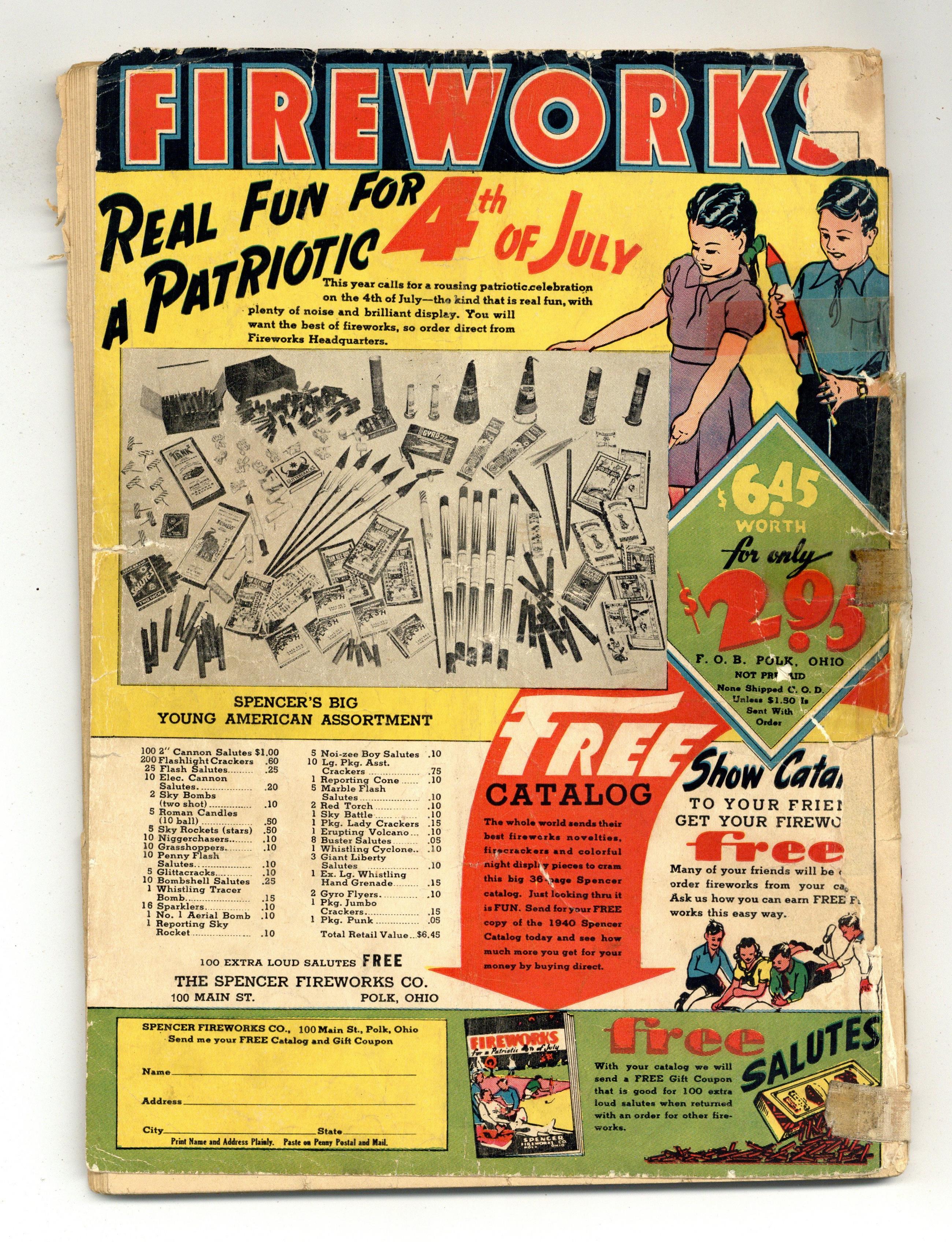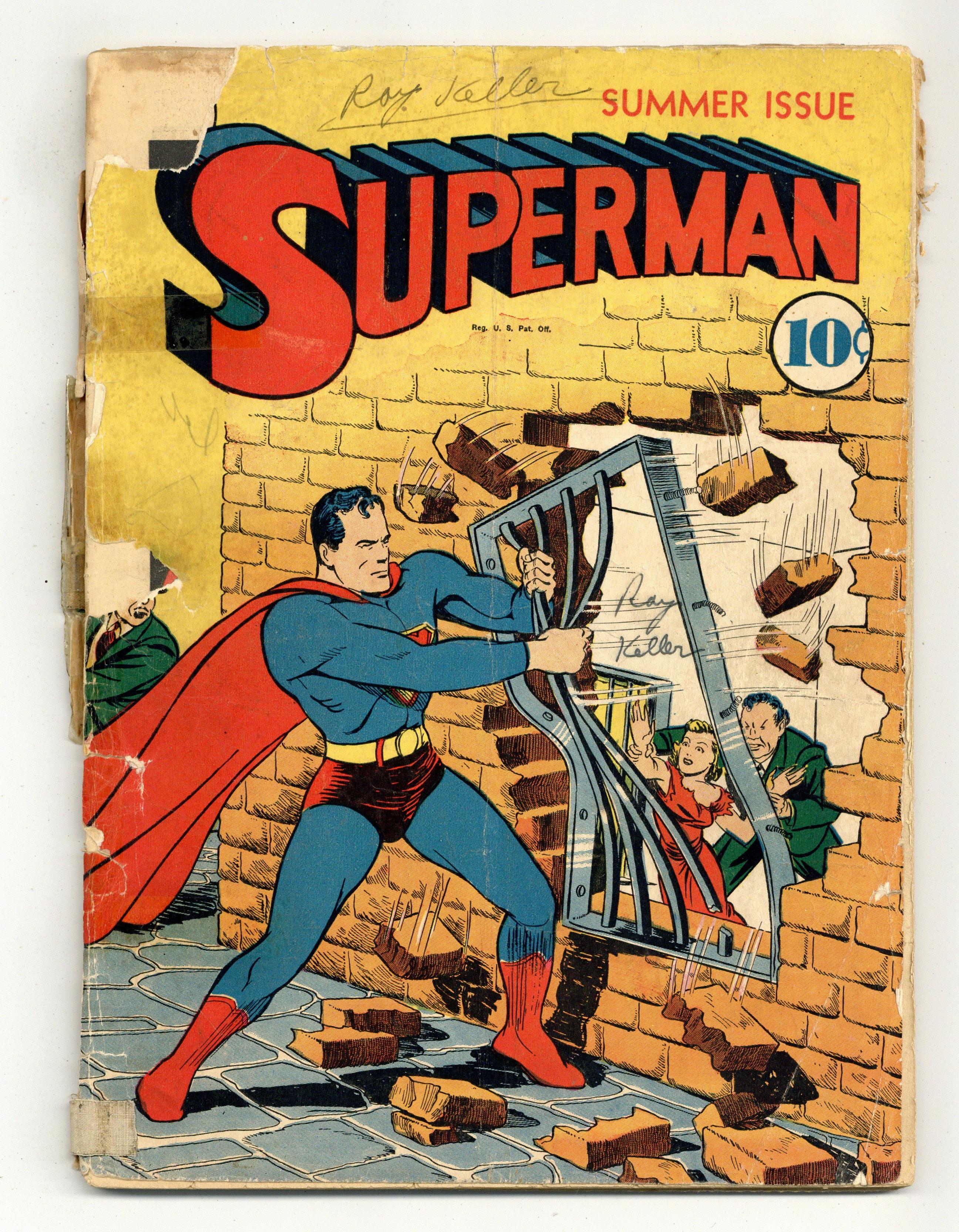 Cover pencils by Wayne Boring. Untitled Superman story, script by Jerry Siegel, pencils by Paul Cassidy (pages 1-8) and Wayne Boring (pages 9-13) [as Joe Shuster], inks by Paul Cassidy (pages 1-8) and Paul Lauretta (pages 9-13) [as Joe Shuster]; Lois and Clark are very concerned when they see business owners trying to induce children into their stores to play slot machines, placed there by the goons of "Slug" Kelly. Superman's Super Strength: Rules for Summer Living. Supermen of America club info. Untitled Superman story, script by Jerry Siegel, art by Paul Cassidy; Punk politician Alex Evell, because of his growing political power, is out to buy the Planet's competitor, so that he will have a newspaper to back up his political dealings. Power of the Press text story, script by George Shute, art by Bernard Baily. Untitled Superman story, script by Jerry Siegel, pencils by Joe Shuster, inks by Wayne Boring [as Joe Shuster]; Clark Kent smells a rat when he enters several offices of financial wizards, hoping to find out why they are profiting during a time of extreme depression. Murder In the Wind text story by Jack Wallis. Two half-page ads for All-Star Comics #1 and Batman #1. Untitled Superman story, script by Jerry Siegel, art by Paul Cassidy; Superman investigates why a noted chemist's serum, parabiolene, financed by a noted gangster named Carlin, is being used on noted people, making them virtual slaves to do the bidding of Carlin. Promotional ad for Action Comics. 68 Pages, Full Color. Cover price $0.10. Grade: PR 0.5 explanation of grade Condition: Used (collectible)