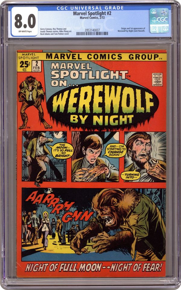 Ended Apr 13 2023 Winning Bid $611 52-page giant. Origin and first appearance of Werewolf By Night. Cover pencils by Neal Adams, inks by Tom Palmer. First Night, script by Roy Thomas (plot); Jean Thomas (plot), and Gerry Conway (script), art by Mike Ploog; Jack learns of the family curse on his eighteenth birthday from his mother on her deathbead; Jack begins to believe that his step-father had his mother killed. House ad for Venus, art by Bill Everett. Where Gargoyles Dwell! starring Venus, script and art by Bill Everett. 52 pages, full color. Cover price $0.25. Grade: CGC 8.0 explanation of grade Condition: Used (collectible)