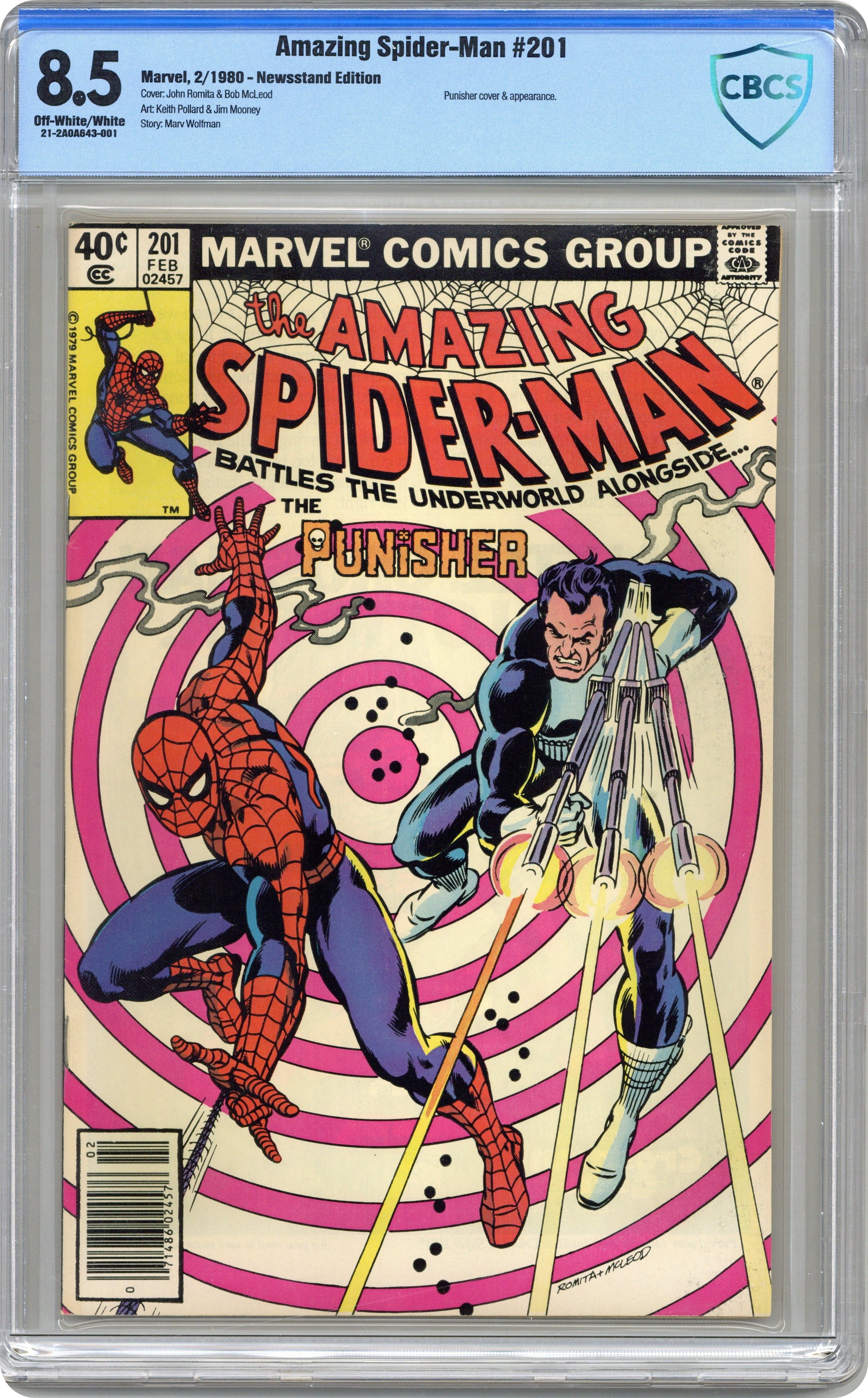Direct Edition. "Man-Hunt!" Part 1 of 2. Guest-starring the Punisher. Script by Marv Wolfman. Art by Keith Pollard (layouts) and Jim Mooney (finishes). Cover by John Romita and Bob McLeod. The action starts with a bang as the web-slinger catches a man falling out of a high-rise office building! When Spider-Man swings inside to investigate, he discovers the source of the problem: the Punisher! What has Frank Castle been up to since Spidey last saw him (in Amazing Spider-Man 175)? Oh, just business as usual...terrorizing the underworld! The following day to his surprise, the Punisher sees pictures of his penthouse gun battle in the Daily Globe! Credited to a photographer named Peter Parker! This troubles the Punisher! And that means trouble for Aunt May's nephew! War Journal Entry #519 is coming up next at a particular superhero's Chelsea apartment! Appearances by J. Jonah Jameson, Joe Robertson, Dr. Marla Madison, Aunt May, and Mary Jane Watson. (Notes: The Punisher previously appeared in Captain America 241. Mary Jane appears next in the classic Marvel Team-Up 79 where (as Red Sonja) she battles Kulan Gath alongside the web-slinger. This is one of Mary Jane's very few appearances between 1979 and 1983. She returns to the Amazing Spider-Man title in issue 238. This story was reprinted in Marvel Tales 218.) 36 pgs. Cover price $0.40. Grade: CBCS 8.5 explanation of grade Condition: Used (collectible)