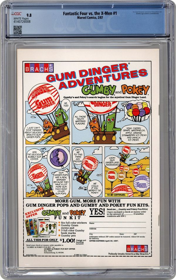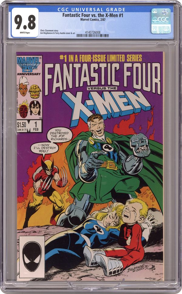 "Are you Sure?!" Story by Chris Claremont. Art by Jon Bogdanove and Terry Austin. Story continued from Uncanny X-Men #312. In the wake of the horrible events of the Mutant Massacre, the X-Men's youngest member, Kitty Pryde, is injured and her own mutant born ability to phase through solid objects threatens her life. With no where left to turn, the outlaw heroes go to the supposed smartest man alive for help, Reed Richards. However, a secret has been discovered that could tear Marvel's First Family apart. Plus, why does the Richards' son, Franklin, keep having precognitive dreams of Wolverine slaughtering his family, and what does the nefarious Doctor Doom have to do with all of this? NOTE: This is without a doubt one of my all time favorite stories. It's continuity heavy and character driven, and it's a darn good read. - Odinson, Lonestar Comics Archivist Cover price $1.50. Grade: CGC 9.8 explanation of grade Condition: Used (collectible)
