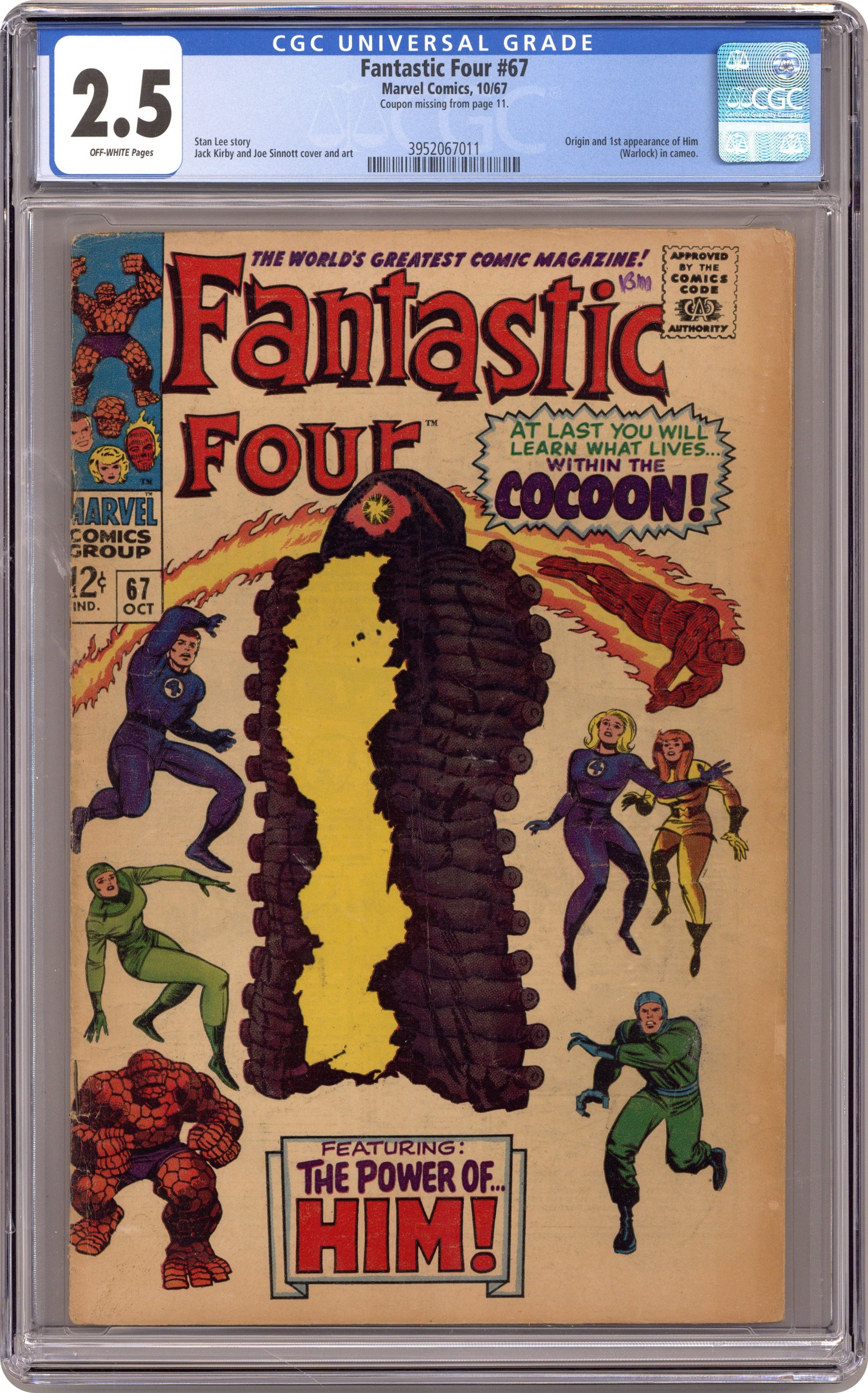 Ended Oct 2 2023 Winning Bid $96 1st printing. Cover pencils by Jack Kirby, inks by Joe Sinnott. Origin (part 2) and first appearance of Him (Warlock) in "When Opens the Cocoon!", script by Stan Lee and Jack Kirby (co-plot), pencils by Jack Kirby, inks by Joe Sinnott; The FF track the kidnapped Alicia to the Beehive, where the cocoon opens and reveals Him. Crystal (of the Inhumans) appearance. 36 pgs. $0.12. NOTE: 1994 JC Penney reprint exists. Can be identified by having a Stridex ad on the back cover. Cover price $0.12. Grade: CGC 2.5 explanation of grade Condition: Used (collectible)