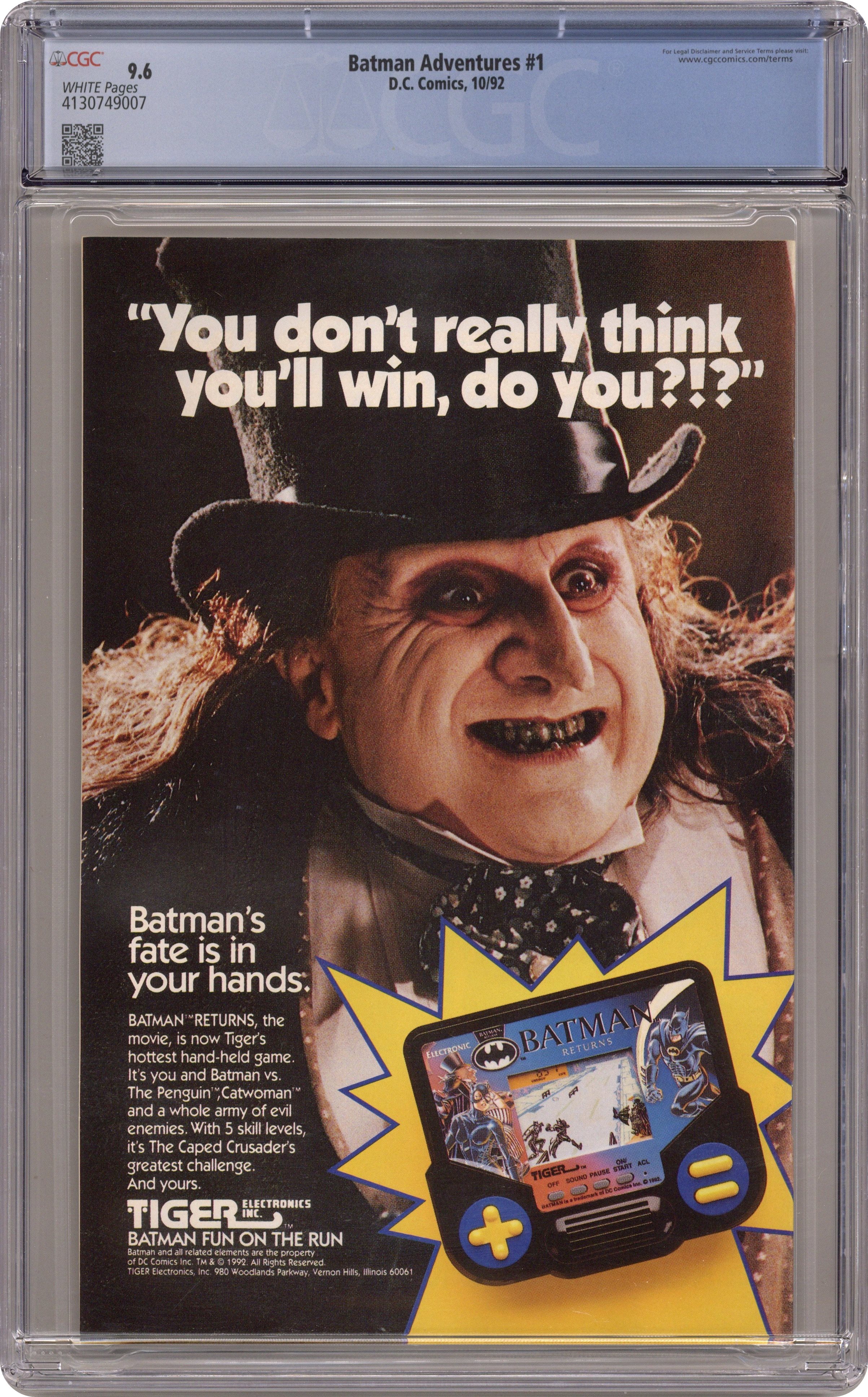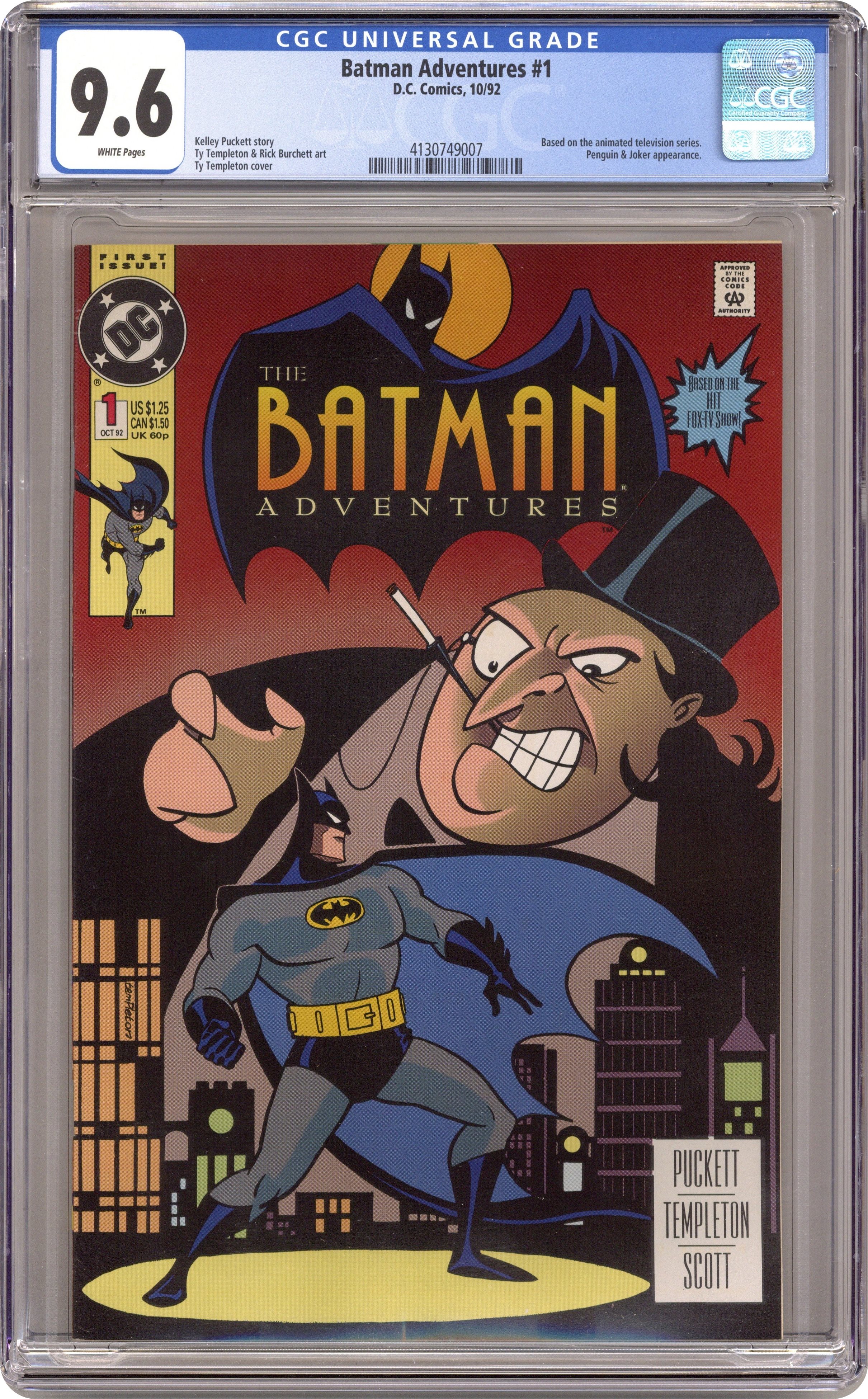 Direct Edition. "Penguin's Big Score." The Penguin gives to charities, but Batman knows something is up. Joke guest-stars. Based on Batman The Animated Series. Script by Kelly Puckett, pencils by Ty Templeton, inks by Rick Burchett. Cover by Templeton. Cover price $1.25. Grade: CGC 9.6 explanation of grade Condition: Used (collectible)