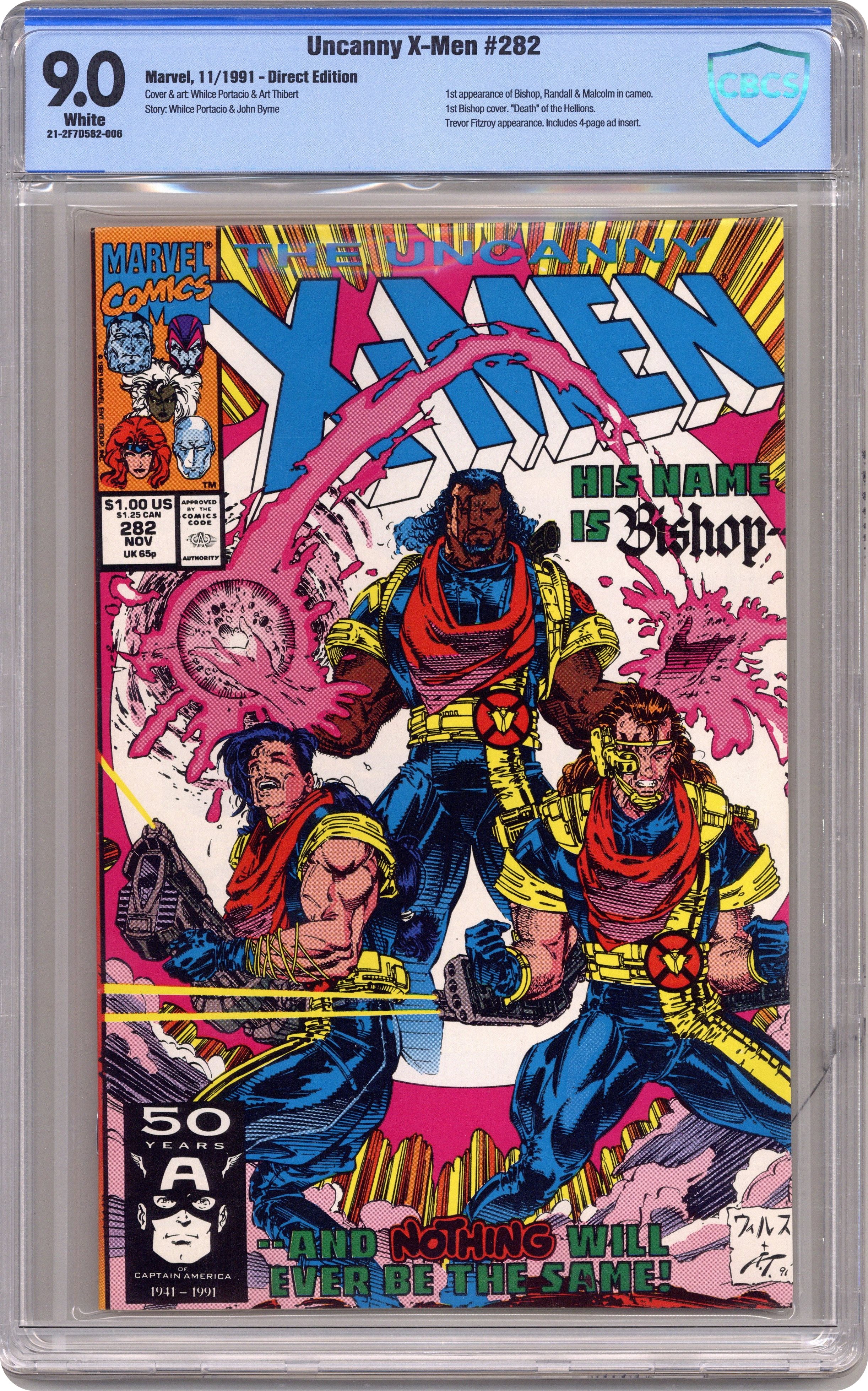 Direct Edition. "Payback!" Story by Whilce Portacio and John Byrne. Art by Whilce Portacio and Art Thibert. In one fell swoop the Upstarts have destroyed the Reavers and crippled the Hellfire Club. Next up, the Mutant Liberation Front. Who can stop these powerful new foes? Enter: Bishop! NOTE: 1st appearance of Bishop. 40 pgs. Cover price $1.00. Grade: CBCS 9.0 explanation of grade Condition: Used (collectible)