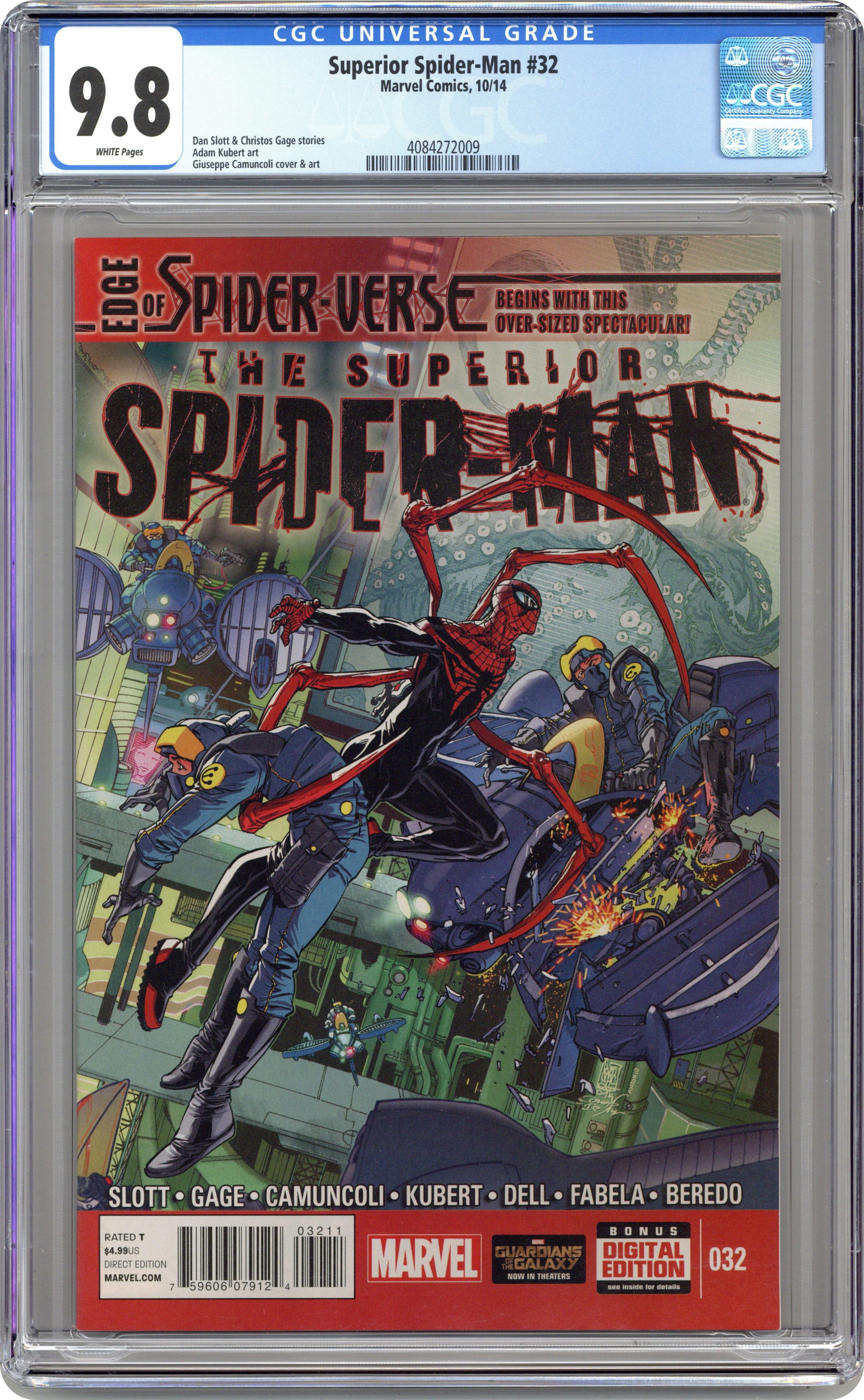Ended Oct 27 2023 Winning Bid $32 Edge of Spider-Verse: Part 1 of 10 - Written by Dan Slott and Christos N. Gage. Art by Giuseppe Camuncoli and Adam Kubert. Cover by Giuseppe Camuncoli. SUPERIOR SPIDER-MAN KICKS OFF THE EDGE OF SPIDER-VERSE! Extra-sized monumental issue, including a story drawn by living legend ADAM KUBERT! How is the Superior Spider-Man still around? Where is he? What is he doing? The road to SPIDER-VERSE STARTS HERE! 36 pages, full color. Cover price $4.99. Grade: CGC 9.8 explanation of grade Condition: Used (collectible)
