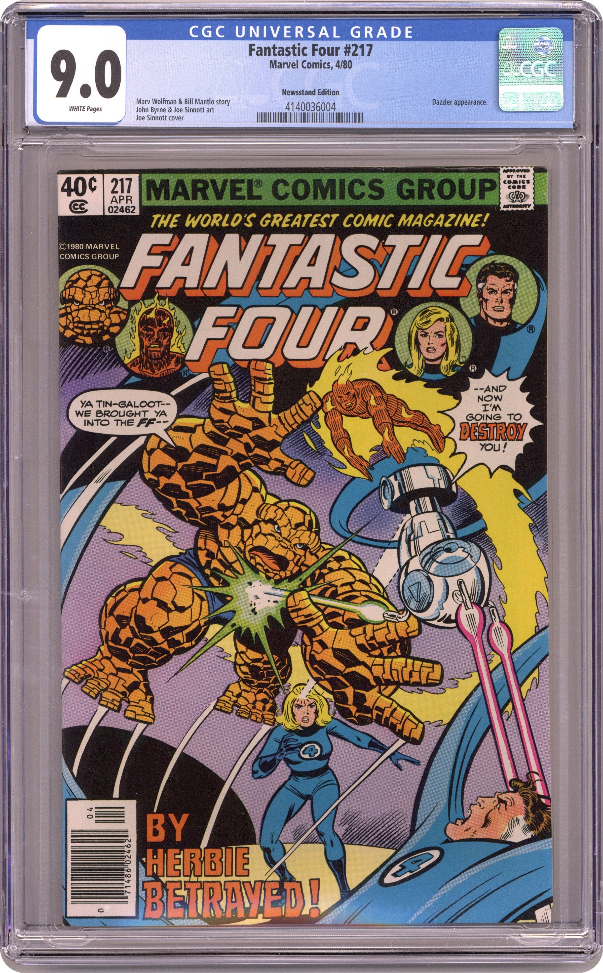 Direct Edition. "Masquerade!" Written by Bill Mantlo. Pencils by John Byrne. Inks by Joe Sinnott. Guest-starring Dazzler. Herbie the Robot has been acting strangely in the past few issues. Is something wrong with the robot that is supposed to be the FF's helper? Apparently so, as the Fantastic Four battle Herbie throughout the Baxter Building! Final appearance of Herbie. 36 pgs. Cover price $0.40. Grade: CGC 9.0 explanation of grade Condition: Used (collectible)