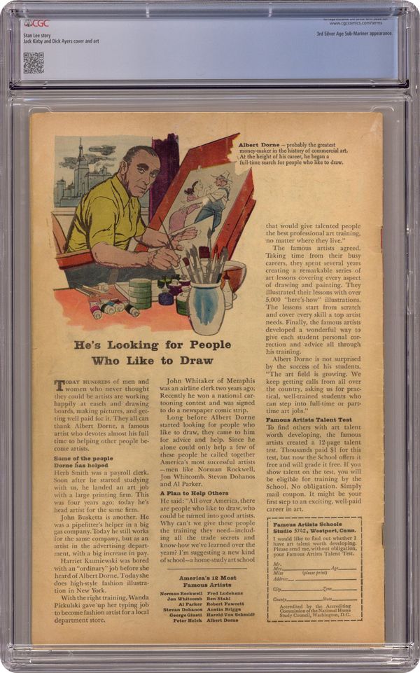 Ended Jul 13 2023 Winning Bid $191 Cover pencils by Jack Kirby, inks by Dick Ayers. Third Silver Age appearance of the Sub-Mariner in "The End of the Fantastic Four!", script by Stan Lee, pencils by Jack Kirby, inks by Dick Ayers; The Fantastic Four are bankrupt and the Sub-Mariner is scheming to use this. How the Human Torch Flies! character profile. Part 2 Sub-Mariner Gives the Orders!; The Sub-Mariner offers the Fantastic Four one million dollars if they star in a film that he's producing. Part 3 "The Fury of Mr. Fantastic"; Mr. Fantastic discovers that the film project is a setup. Part 4 "The Flame of Battle"; Human Torch and Thing discover that the film project is a setup. Vengeance Is Ours! Part 5; The film is produced and an unwilling Sub-Mariner pays the Fantastic Four their money. Letter to the editor from MyComicShop president Buddy Saunders! 36 pages, full color. Cover price $0.12. Grade: CGC 3.5 explanation of grade Condition: Used (collectible)