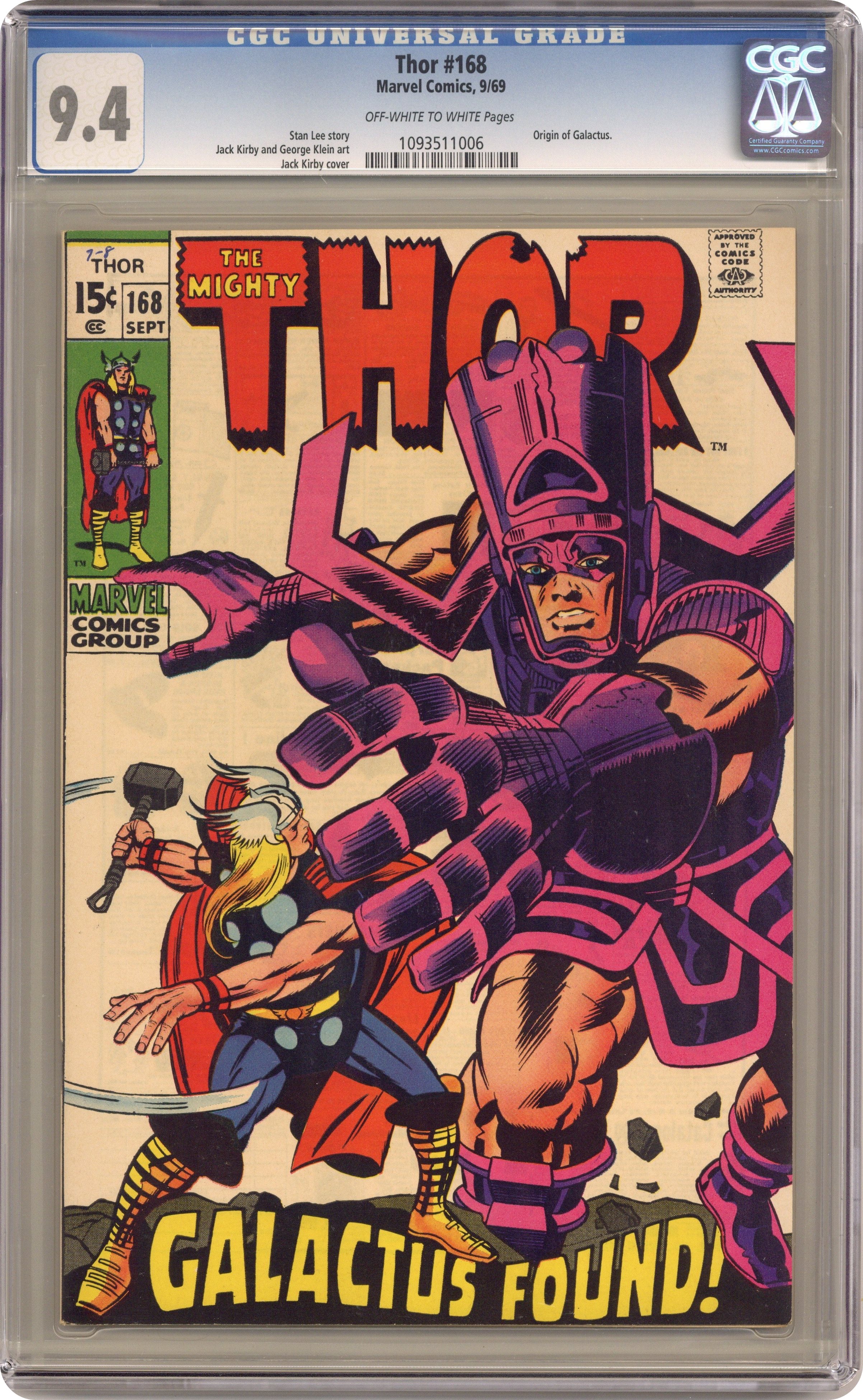 Cover pencils by Jack Kirby, inks by Joe Sinnott. Galactus origin, part 1 in "Galactus Found!", script by Stan Lee, pencils by Jack Kirby, inks by George Klein; Thor takes the Odinship in search of Galactus; Galactus captures the Odinship and begins to tell his origin to Thor; Meanwhile, on Earth, a foreign country completes their creation of the Thermal Man and rockets him to the US to wreak havoc. Appearances by Balder, Hogun, Fandral, Volstagg, the Watcher, and Odin. First appearance of the Thermal Man. Bullpen Bulletins. 36 pgs., full color. $0.15. Cover price $0.15. Grade: CGC 9.4 explanation of grade Condition: Used (collectible)