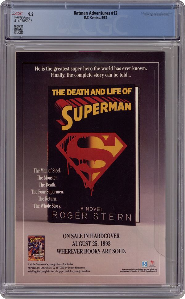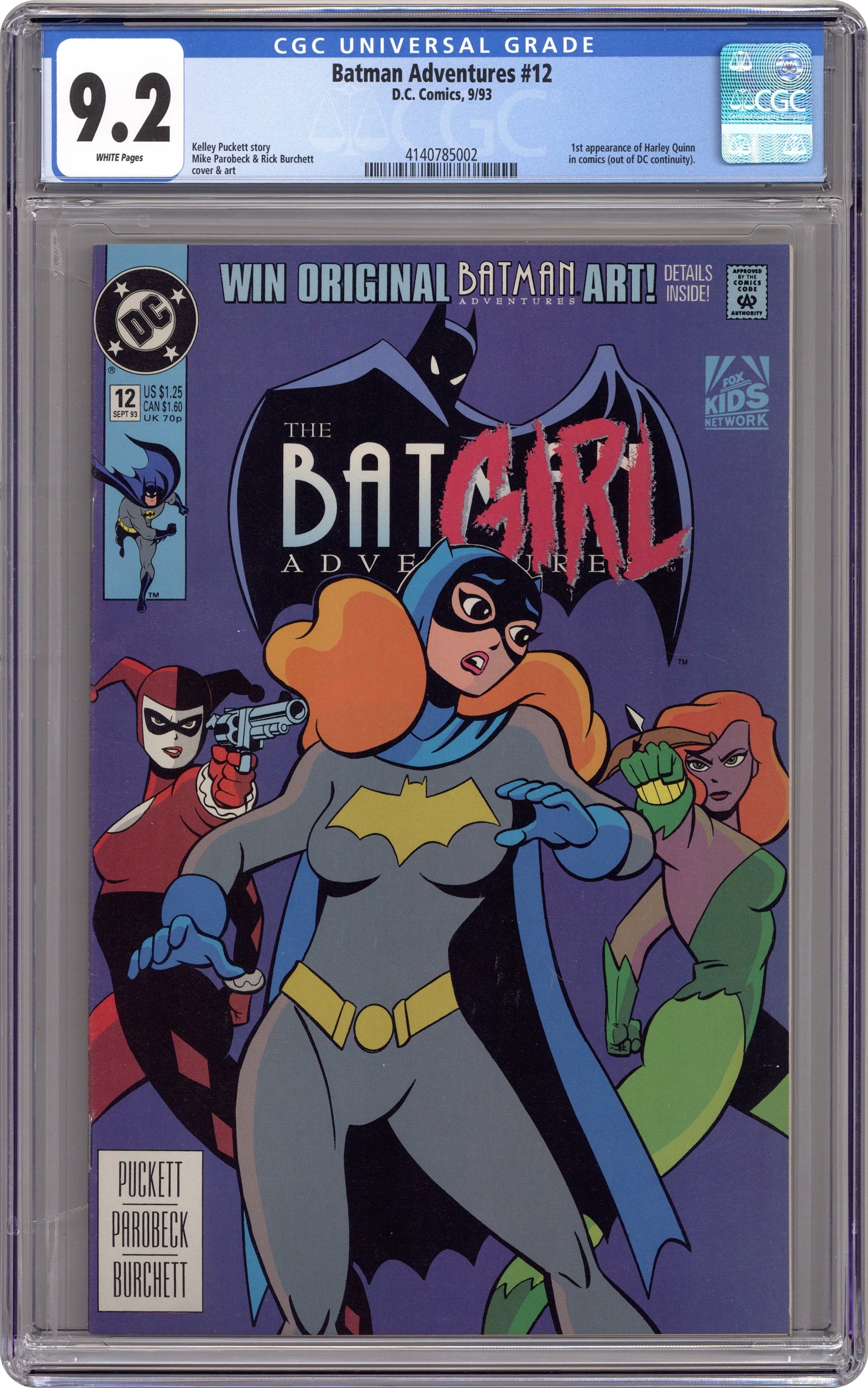 Direct Edition. 1st appearance of Harley Quinn in a comic book. "Batgirl: Day One." Barbara Gordon attends a costume party dressed as Batgirl. Unfortunately, Poison Ivy and Harley Quinn also decide to show up. Based on Batman The Animated Series. Script by Kelley Puckett, pencils by Mike Parobeck, inks by Rick Burchett. Cover by Parobeck. Cover price $1.25. Grade: CGC 9.2 explanation of grade Condition: Used (collectible)