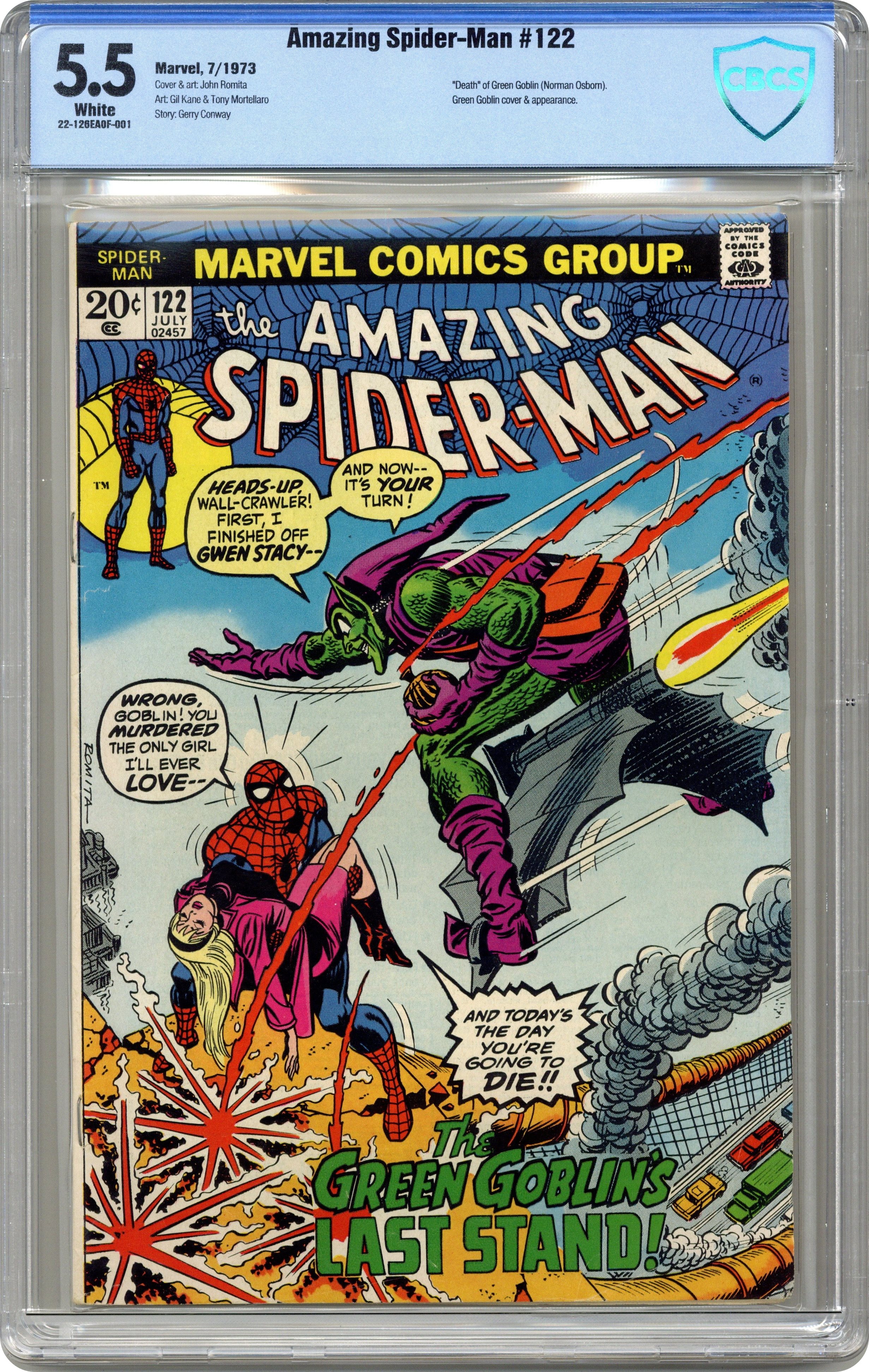 Ended Oct 25 2023 Winning Bid $152 Death of the Green Goblin (aka Norman Osborn) in "The Goblin's Last Stand!" Part 2 of 2. Script by Gerry Conway. Pencils by Gil Kane. Inks by John Romita and Tony Mortellaro (backgrounds). Cover by John Romita. In unfathomable fashion atop the Brooklyn Bridge, Gwen Stacy perished at the hands of the Green Goblin. Spider-Man is devastated. And he furiously lashes out at the goblin, but the purple and green-clad killer gets away! However, a while later, the wall-crawler receives a tip from Joe Robertson about Norman Osborn's whereabouts. And in an abandoned and decrepit warehouse, the Amazing Spider-Man and the Green Goblin fight for the final time! At the end of their epic battle, Peter Parker painfully realizes that revenge is bittersweet. The passing of the goblin won't bring back Gwen. He must find a way to move forward with his life. Perhaps Mary Jane Watson will help. Cameo appearances by Harry Osborn and J. Jonah Jameson. (Notes: The stunning death scene of the Green Goblin inspired a similar moment in the2002 Spider-Man movie. This issue was reprinted in Marvel Tales #99 and again in issue 192.) 36 pages. Cover price $0.20. Grade: CBCS 5.5 explanation of grade Condition: Used (collectible)