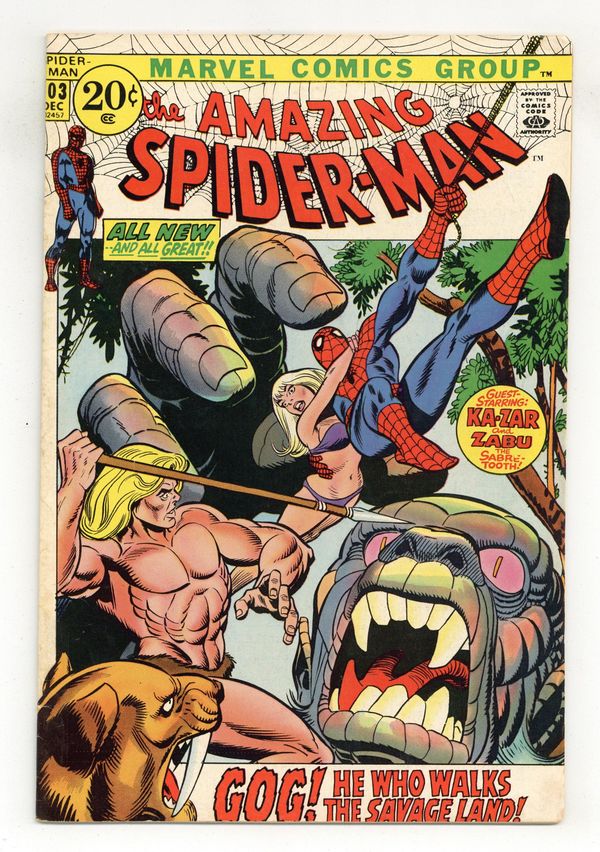 "Walk the Savage Land!" Part 1 of 2. Guest-starring Ka-Zar. Script by Roy Thomas. Pencils by Gil Kane. Inks by Frank Giacoia. Cover by Gil Kane and Frank Giacoia. Spider-Man and Gwen Stacy in the Savage Land with Ka-Zar!What a cover preview! But how did they get there? The story begins a few days earlier when J. Jonah Jameson -- upset about the Daily Bugle's declining circulation numbers -- hears a tale about a mysterious monster in the Savage Land. Jonah immediately orders an in-depth feature on Ka-Zar'shidden jungle to boost the Bugle's sales! And he will lead the expedition to Antarctica himself! However the Savage Land is fraught with danger. Shortly after the group arrives, the gigantic monster called Gog grabs Gwen!And the web-slinger will move heaven and earth...and anything else in the Savage Land...to get her back! Cameo appearances by Joe Robertson, Zabu, and Kraven the Hunter. First 20ยข cover price. (Notes: Ka-Zar and the web-slinger first met in Amazing Spider-Man #57. This issue was reprinted in Marvel Tales #81 and #82.) 36 pages. Cover price $0.20. Grade: GD/VG 3.0 explanation of grade Condition: Used (collectible)
