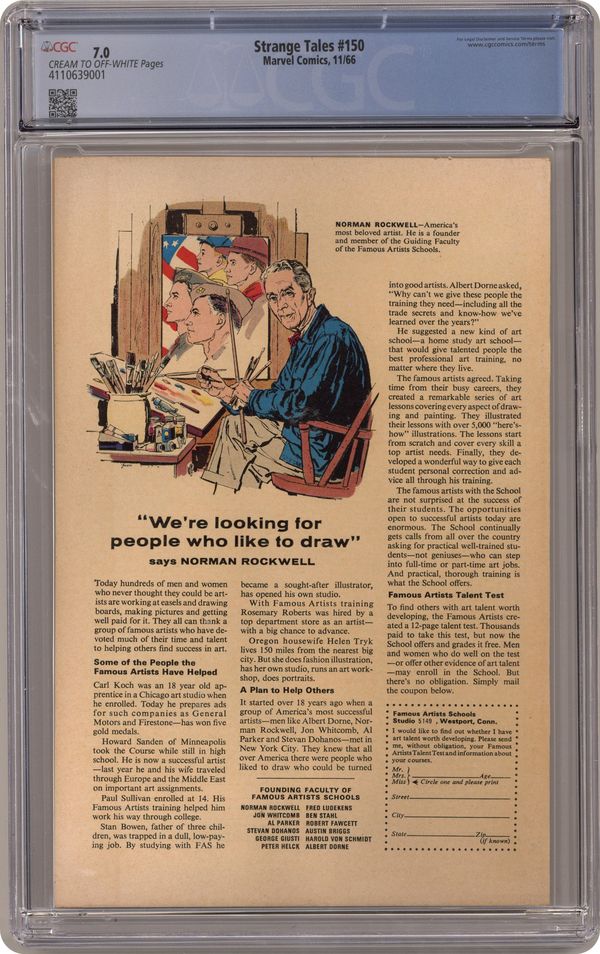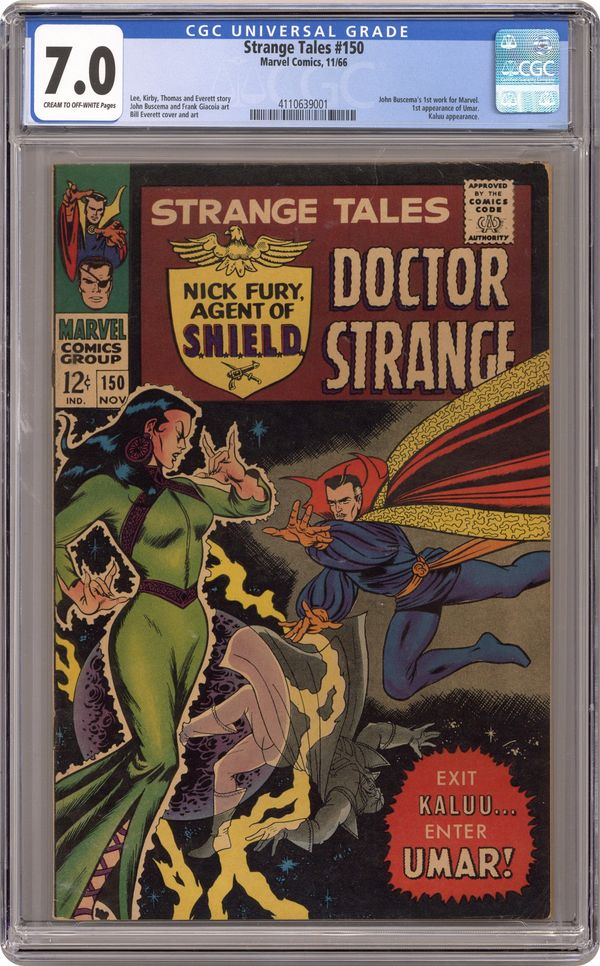 Cover art by Bill Everett. Nick Fury stars in "Hydra Lives!", script by Stan Lee and Jack Kirby (co-plot), pencils by Jack Kirby (layouts) and John Buscema (his first work for Marvel), inks by Frank Giacoia; Fury subjects himself to a dangerous test in order to prove that an atomic missile can be detonated long-distance by a sonic weapon which SHIELD believes HYDRA has; While both he & Dugan are recovering from injuries, Don Cabellero, at the urging of an undercover SHIELD man, invites Fury to a party in ancient Karnopolis in the Sahara Desert; Caballero is a disguise for the new Supreme Hydra, who is aware a SHIELD agent has invaded his ranks. First appearance of Umar (the sister of Dormammu) in "The Conquest of Kaluu!", script by Roy Thomas and Bill Everett (co-plot), art by Bill Everett; Kaluu realizes Strange and the Ancient One have escaped to the past of ancient Babylonia where The Ancient One obtains The Book Of The Vishanti; Before Kaluu can extinguish the Flames of the Faltine, Strange returns to the present with the mystic book which hurls his spell back to him; The Ancient One sends Kaluu into Limbo for all time; In The Dark Dimension Clea fears the onslaught of the Mindless One's freed from their prison with Dormammu gone. Letter to the editor from Carl Gafford. Merry Marvel Marching Society info and coupon. 36 pgs., full color. Cover price $0.12. Grade: CGC 7.0 explanation of grade Condition: Used (collectible)