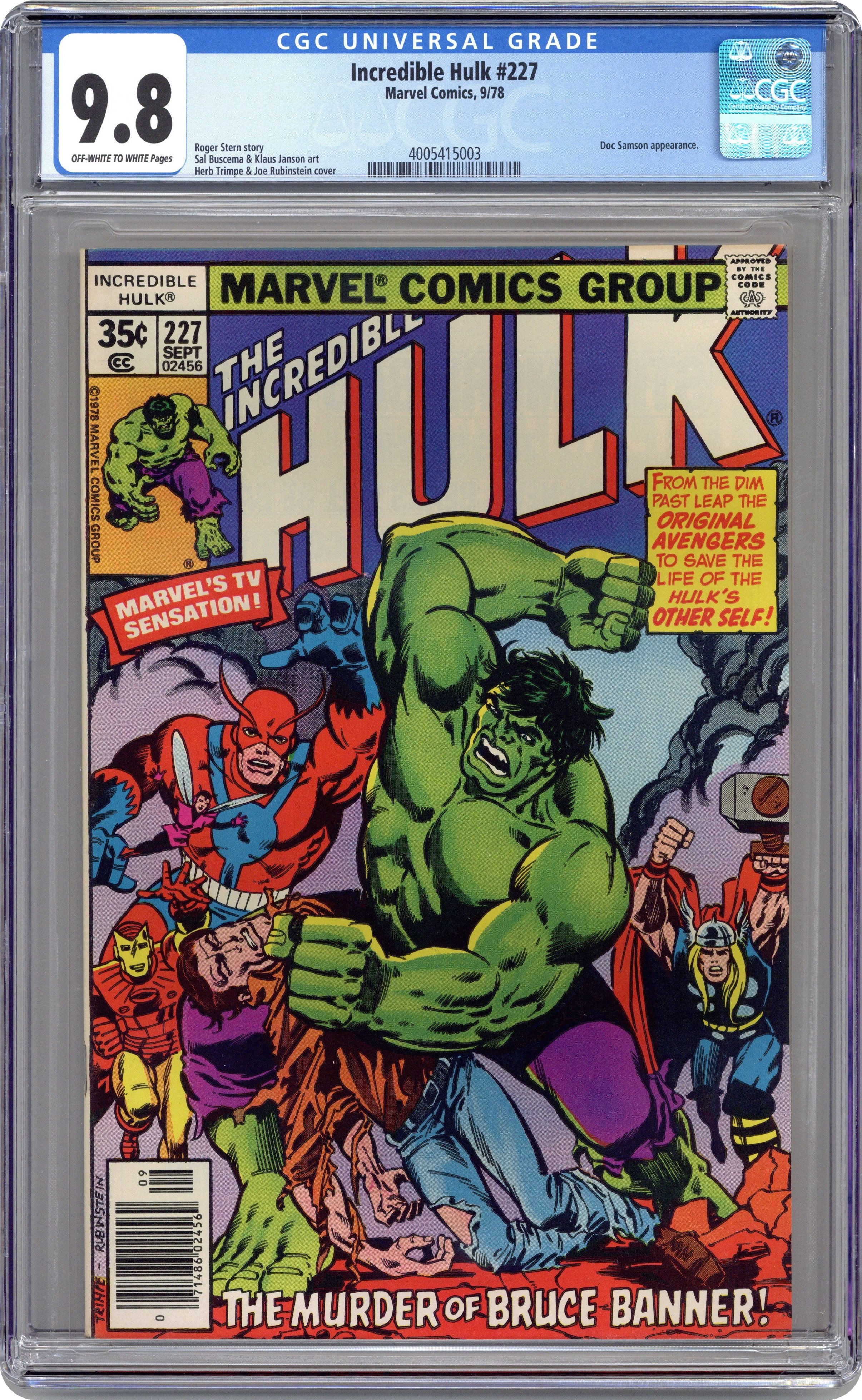 "The Monster's Analyst." Guest starring Doc Samson and the Avengers (sort of). Story by Roger Stern. Art by Sal Buscema and Klaus Janson. Cover by Herb Trimpe. Renown psychiatrist Dr. Leonard Samson enters the Hulks fractured psyche to help the man-brute control his inner rage. As the events of Banner's past unfold Samson bears witness to the Hulk's origins. But, what happens when the Hulk comes face-to-face with his alter ego Bruce Banner. Hulk smash! Not if the Avengers have anything to say about it. Get ready for one of the strangest Hulk stories of all. 36 pages. Cover price $0.35. Grade: CGC 9.8 explanation of grade Condition: Used (collectible)