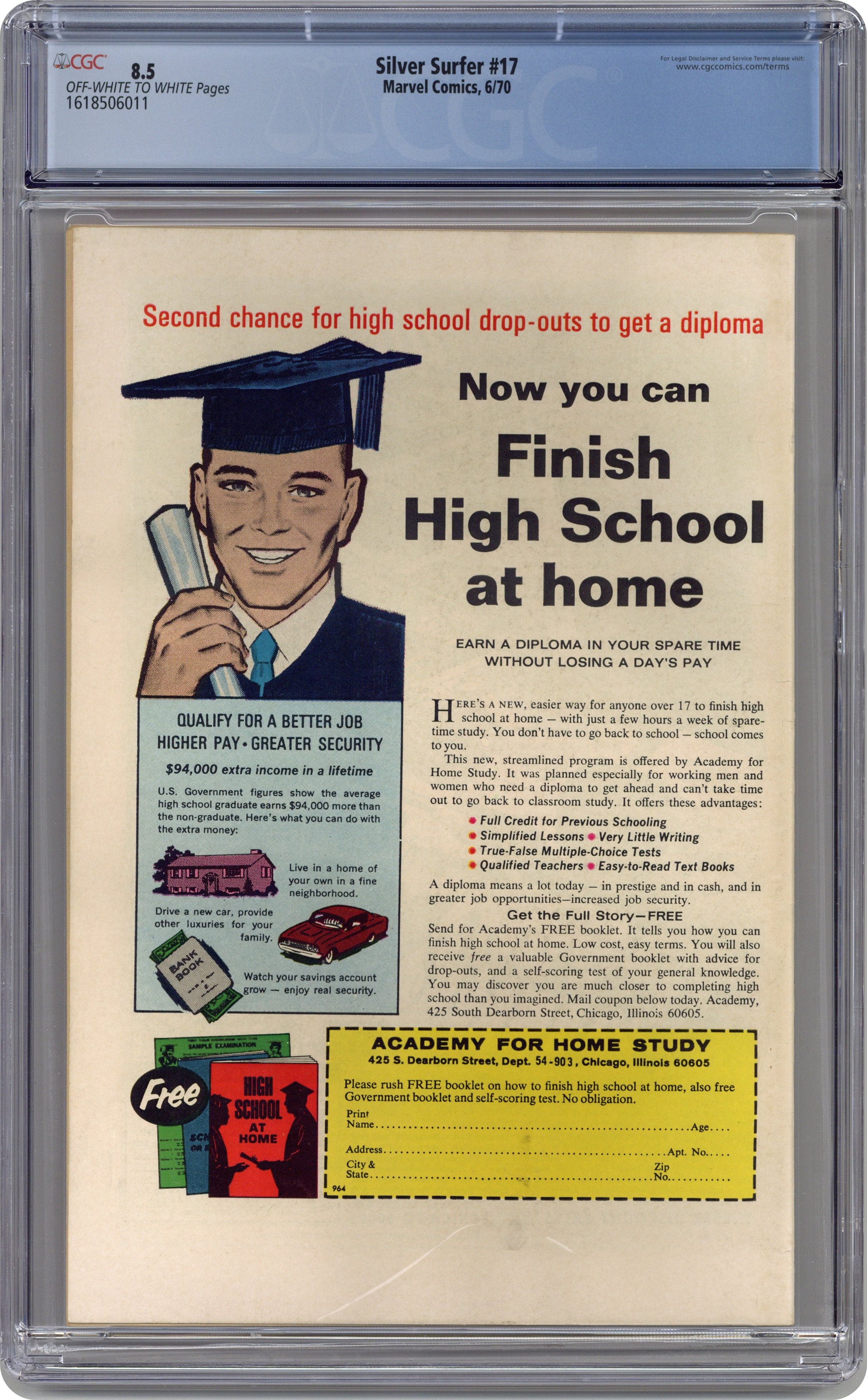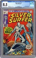 Mephisto and Nick Fury guest star in "The Surfer Must Kill!" Script by Stan Lee, pencils by John Buscema, inks by Chic Stone. Brief Fantastic Four appearance. Barry Windsor-Smith cover pencils. Cover price $0.15. Grade: CGC 8.5 explanation of grade Condition: Used (collectible)