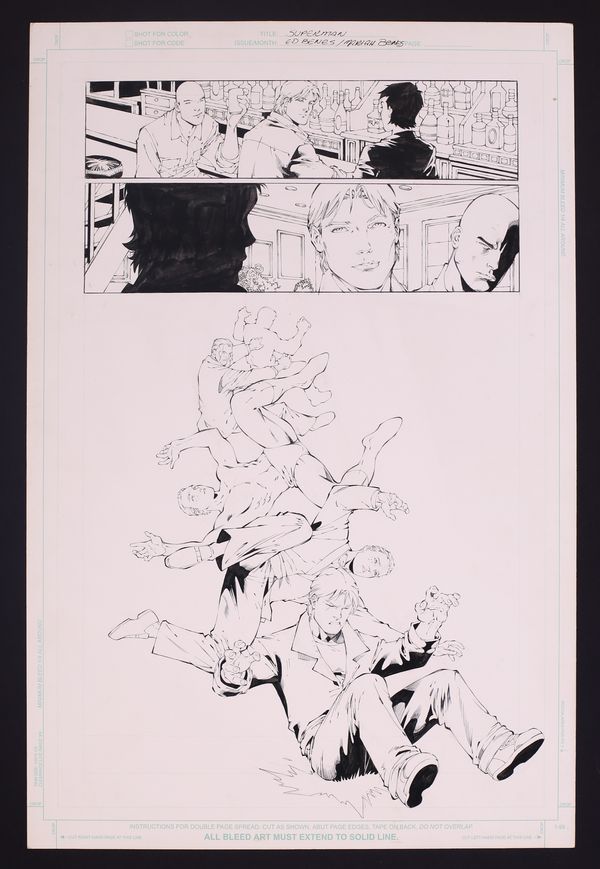 Original Unpublished Art from Superman (c. 2005) by Ed and Mariah Benes. This 3/4 splash page, likely cut from the Benes' Superman run in 2005-2006 sees Jimmy Olsen having a drink before getting tossed through space and time- likely due to the events of the lead-up to Infinite Crisis! Pencil and ink on art board. 11 1/4" x 17 1/4"