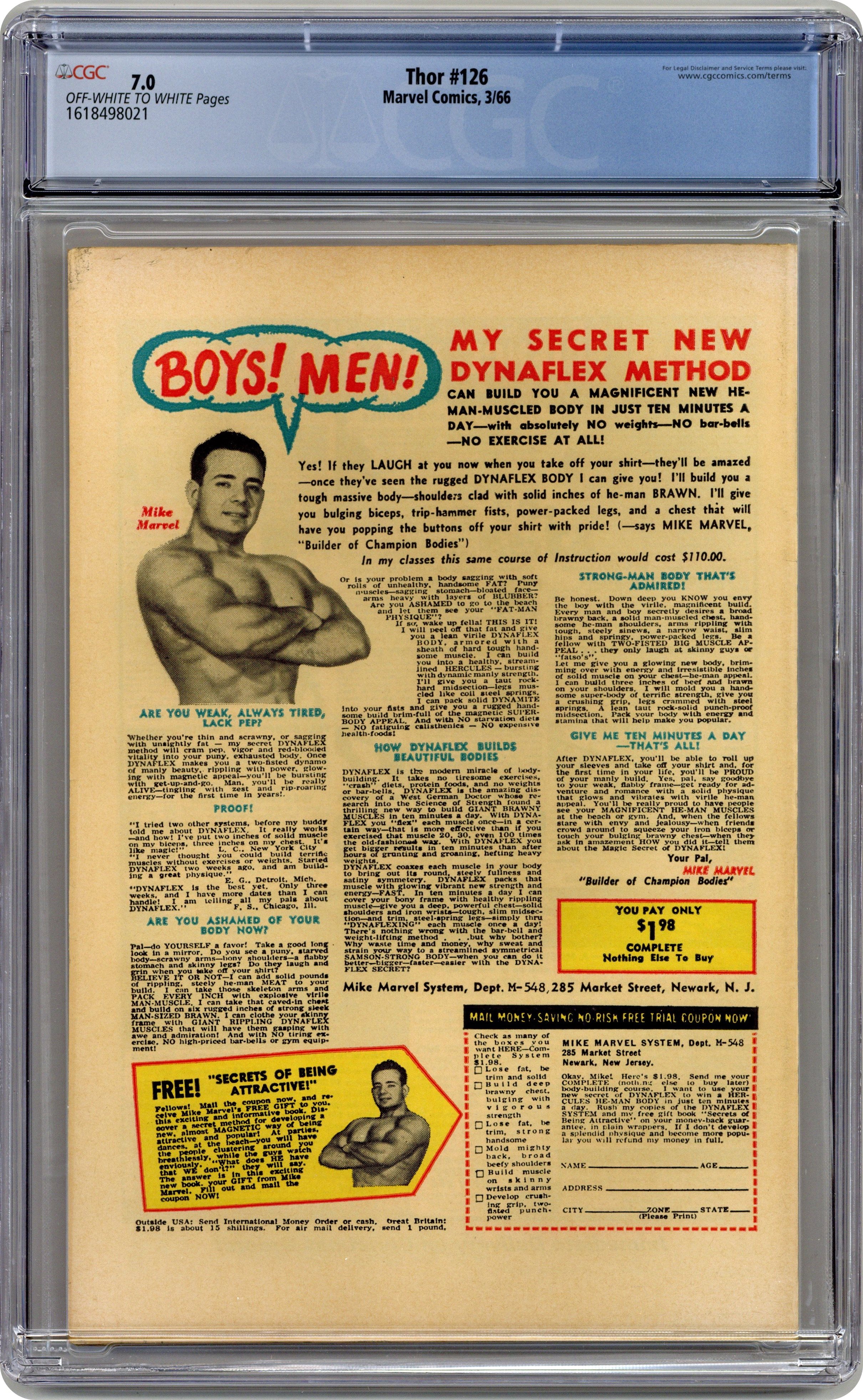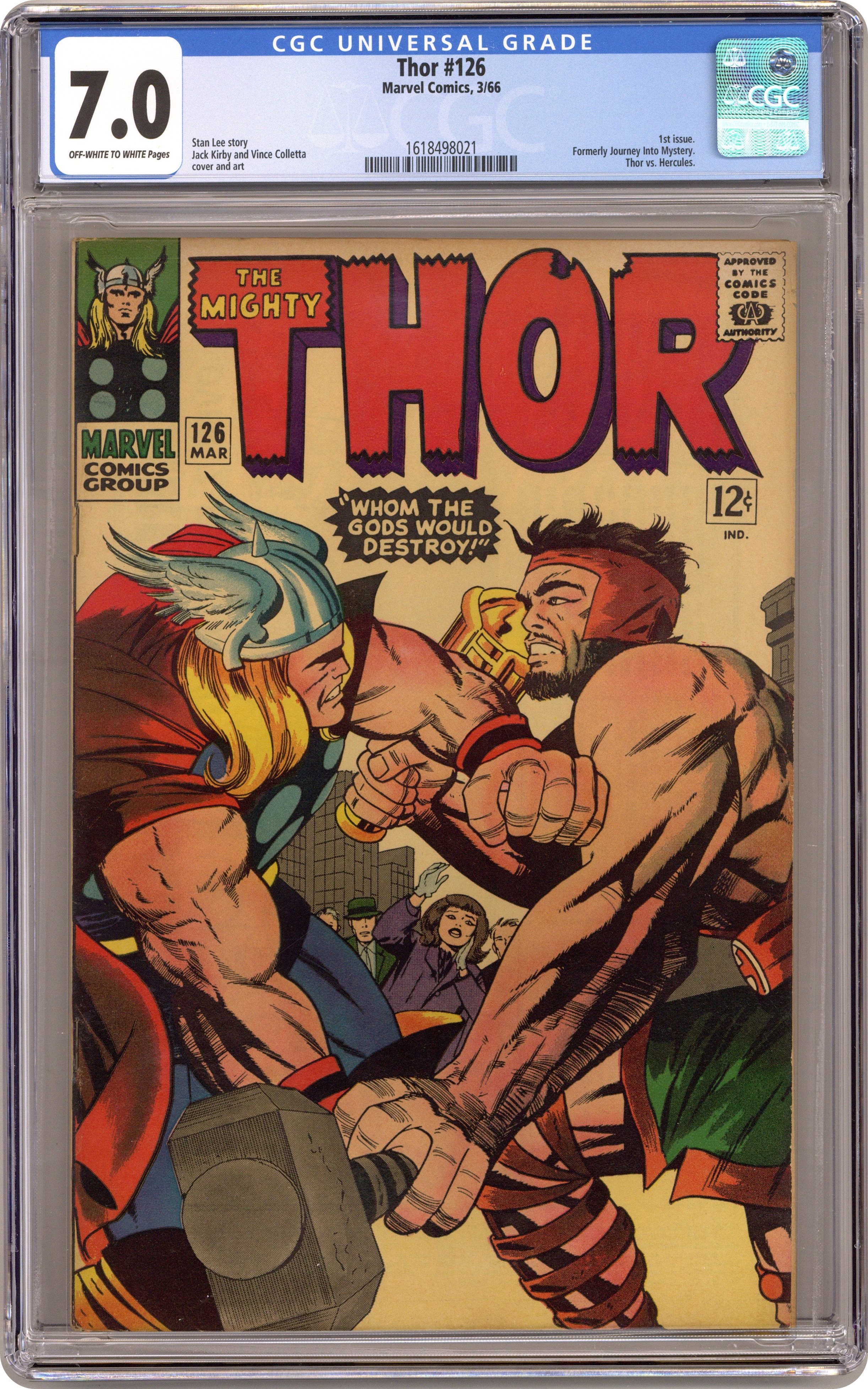Title becomes Thor; previously Journey Into Mystery. Cover pencils by Jack Kirby, inks by Vince Colletta. "Whom the Gods Would Destroy!", script by Stan Lee, pencils by Jack Kirby, inks by Vince Colletta; Thor and Hercules fight over Jane Foster; Odin, still angry because Thor revealed his identity to Jane, removes half Thor's powers by giving 'Odin Power' to Seidring. Hercules defeats Thor. Marvel Bullpen Bulletins. Tale of Asgard: "The Summons!", script by Stan Lee, pencils by Jack Kirby, inks by Vince Colletta; The Argonauts are called home to Asgard by Odin. Appearances by Balder, Hogun, Fandral, Volstagg, and Odin. The letters page contains a statement of ownership, management and circulation: average print run 377,663; average paid circulation 232,644. 36 pgs., full color. $0.12. Cover price $0.12. Grade: CGC 7.0 explanation of grade Condition: Used (collectible)