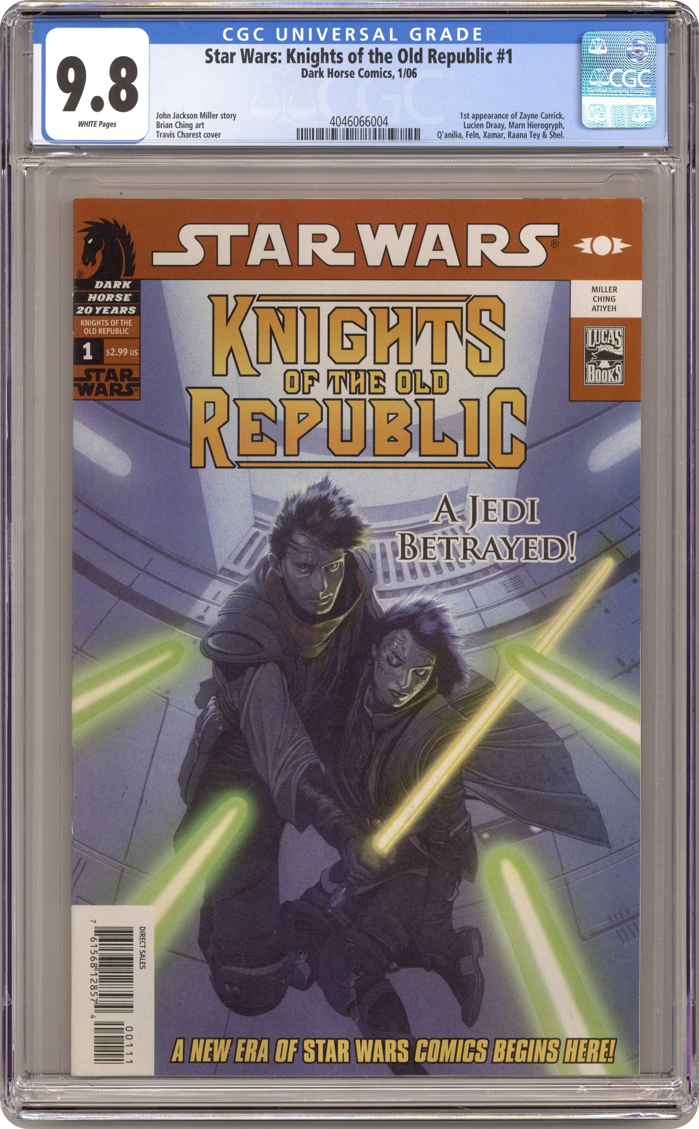 1ST PRINTING. JOHN JACKSON MILLER (W), BRIAN CHING (P), MICHAEL ATIYEH (C), and TRAVIS CHAREST (Cover) FC, 32pg, $2.99. On the planet Taris, a young Padawan named Zayne has been framed for a heinous and brutal crime against the Jedi order. Suddenly a wanted fugitive and on the run from his Jedi Masters, Zayne is forced to ally himself with the under-city's criminals, con artists, and petty thieves he'd previously vowed to bring to justice. Staying alive is the first order of business and if he's ever to clear his name, Zayne must make this new alliance work ... providing he survives the experience. ? To celebrate its twentieth anniversary, Dark Horse is completely relaunching its Star Wars publishing line. This series is the first of many new titles to come. ? A new ongoing monthly series written by John Jackson Miller (Iron Man) and illustrated by Brian Ching (Star Wars Obsession), set four thousand years before the rise of the Empire and the fall of Anakin Skywalker (and eight years prior to the events in the Knights of the Old Republic video game). ? A great starting point for anyone interested in following the Star Wars saga beyond the films. ? Cover by fan-favorite artist Travis Charest (WildC.A.T.S., WildC.A.T.S/X-Men)! Cover price $2.99. Grade: CGC 9.8 explanation of grade Condition: Used (collectible)