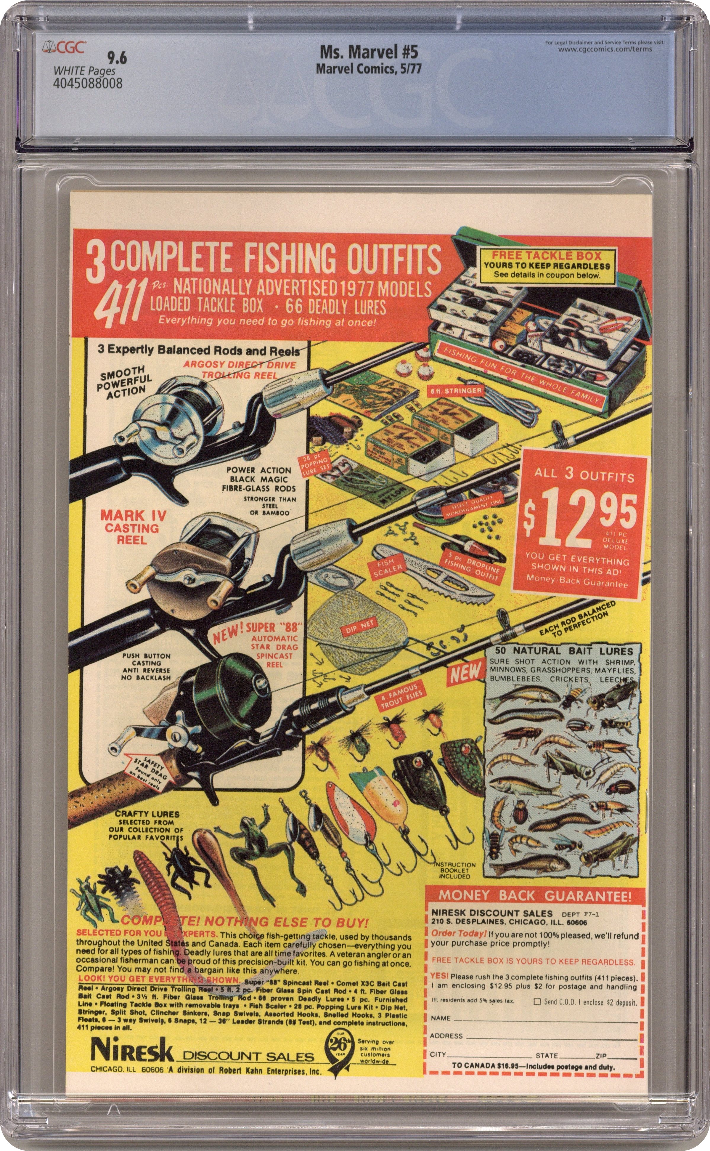Cover pencils by Ed Hannigan, inks by Joe Sinnott. Bridge of No Return, script by Archie Goodwin (plot), Jim Shooter (plot), and Chris Claremont (script), pencils by Jim Mooney, inks by Joe Sinnott; Ms. Marvel tries to stop a new Stark super-truck carrying radioactive cargo before disaster strikes, but she has to go through the Vision to do it; Ms. Marvel origin re-cap with cameos by Captain Marvel and Spider-Man's J. Jonah Jameson. Captain America and the Sore Sir's Apprentices Hostess Cup Cakes ad with Captain America. 36 pgs. $0.30. Cover price $0.30. Grade: CGC 9.6 explanation of grade Condition: Used (collectible)