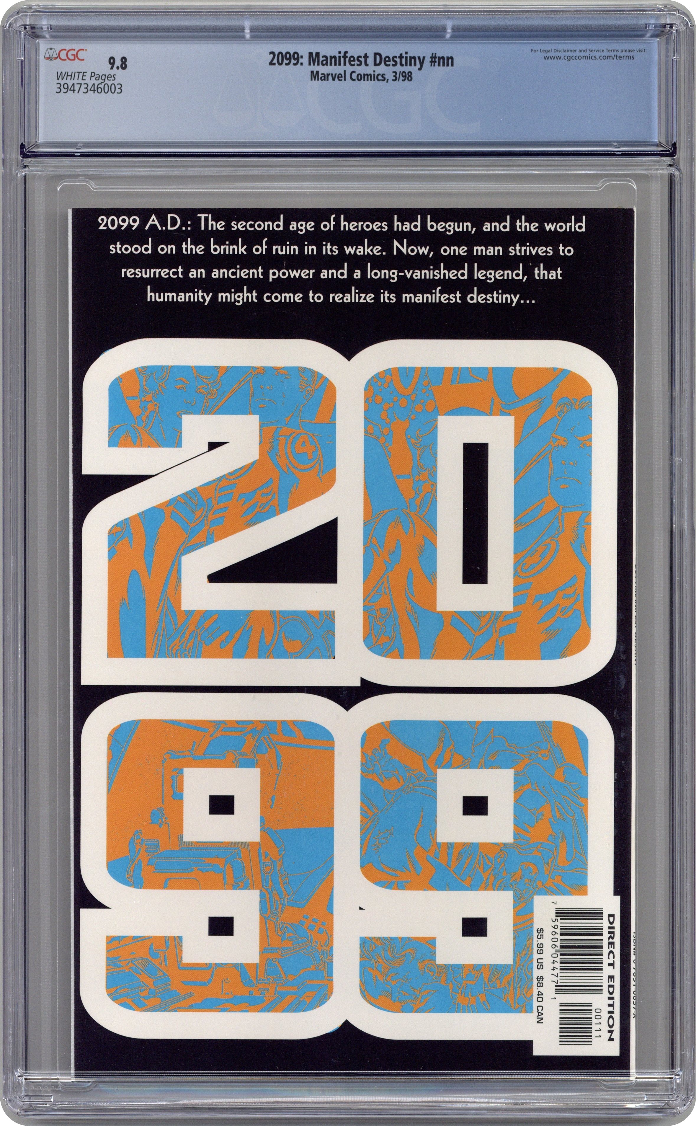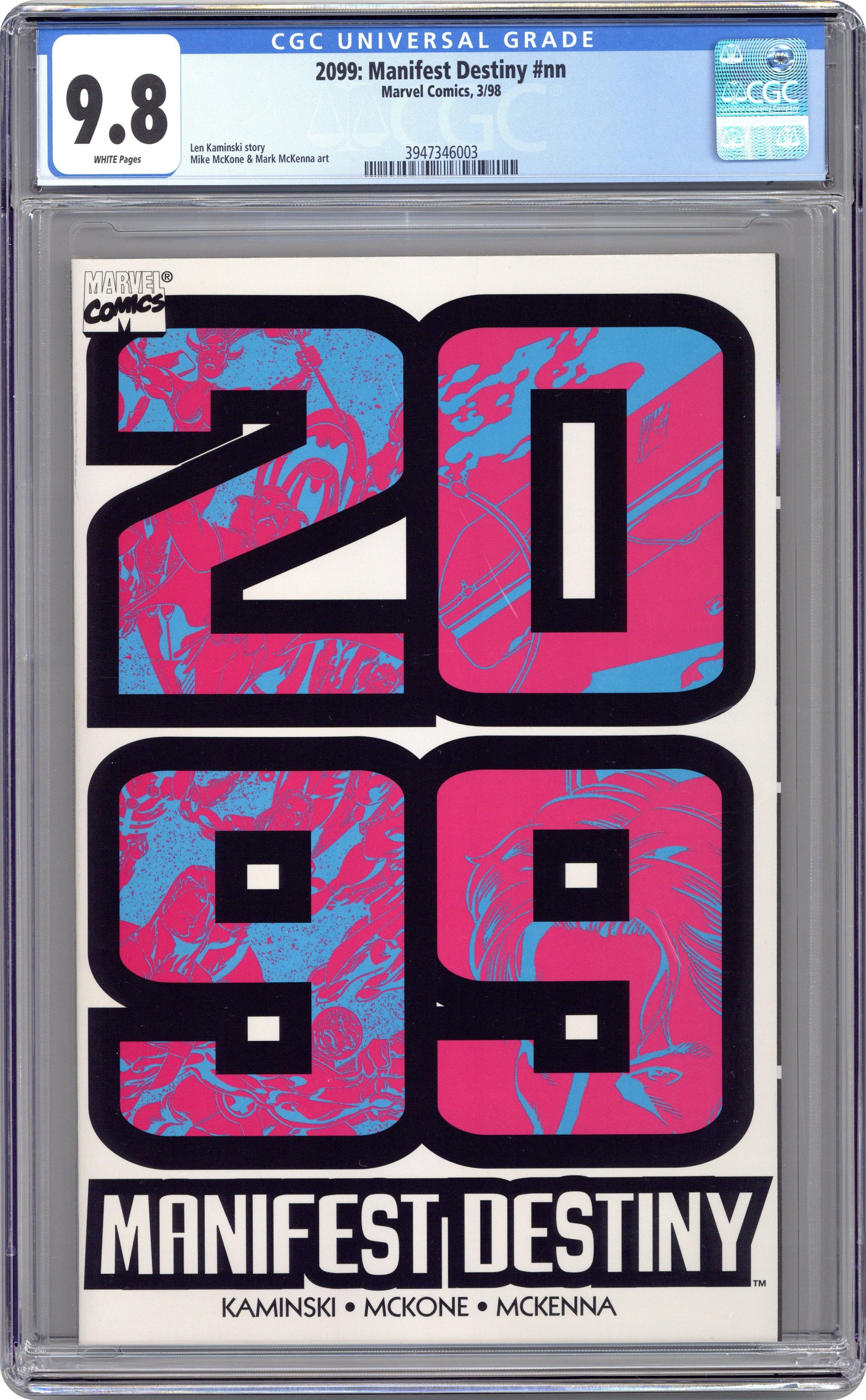 Written by Len Kaminski. Art and Cover by Mike McKone & Mark McKenna. Is it the end of the Marvel Universe...or the beginning of a bold new era? That's what the heroes of the year 2099 must determine! Featuring Spider-Man 2099, Captain America, Moon Knight 2099 (introduction), Uatu, Fantastic Four 2099 (origin), Xi'an Chi Xan and Ghost Rider 2099. 48 pages, full color. Cover price $5.99. Grade: CGC 9.8 explanation of grade Condition: Used (collectible)