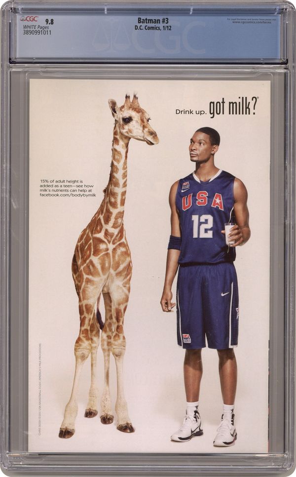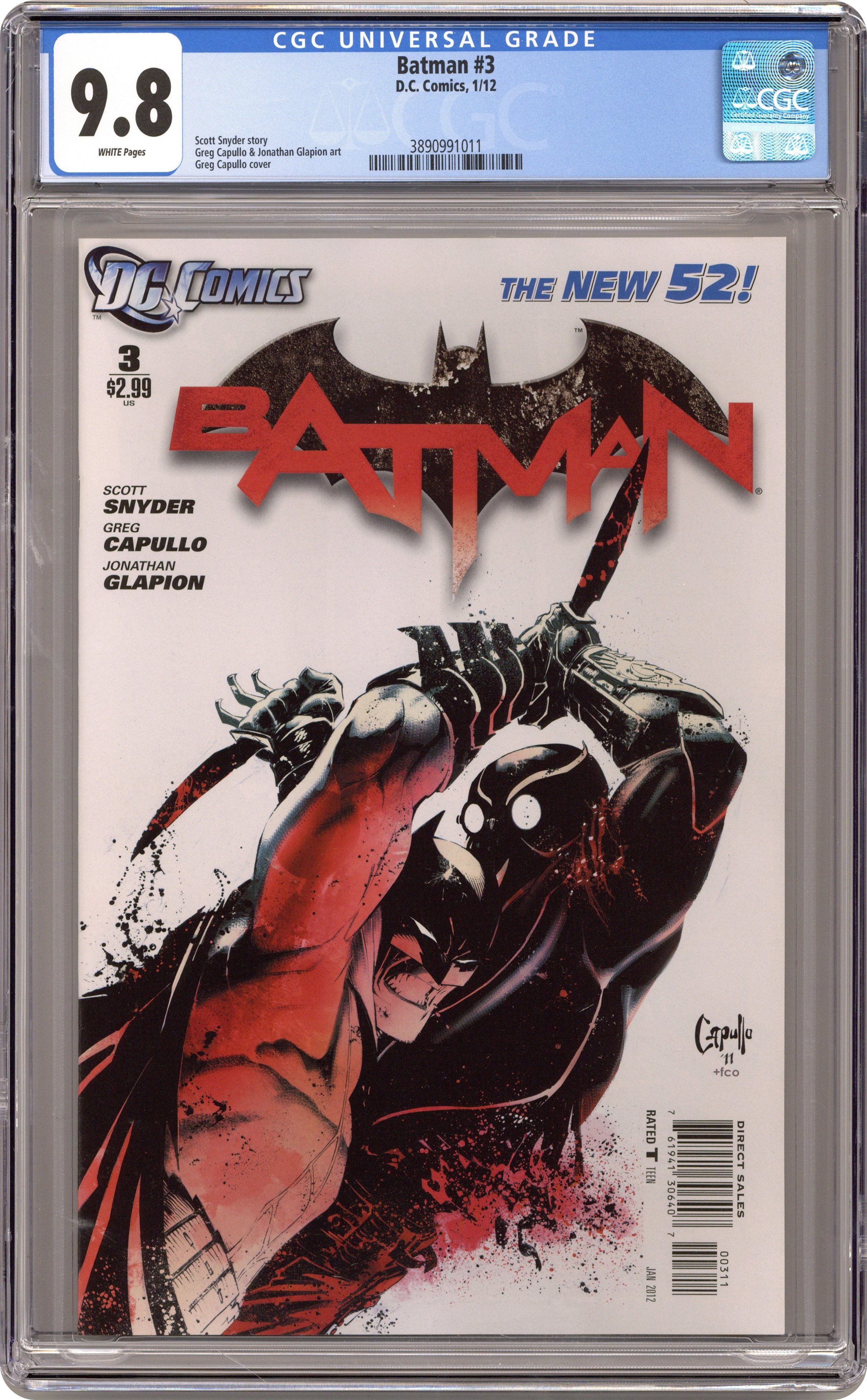 Cover by GREG CAPULLO Written by SCOTT SNYDER Art by GREG CAPULLO and JONATHAN GLAPION As Bruce digs deeper into the mystery of the recent owl murders, he soon finds himself face to face with a shocking enemy - an enemy the Wayne family has secretly been at war with for centuries. Be there for the first shots of the war for the soul of Gotham City. Friends will become deadly enemies and secrets will be revealed - revelations that will change the Bat-family forever. Cover price $2.99. Grade: CGC 9.8 explanation of grade Condition: Used (collectible)