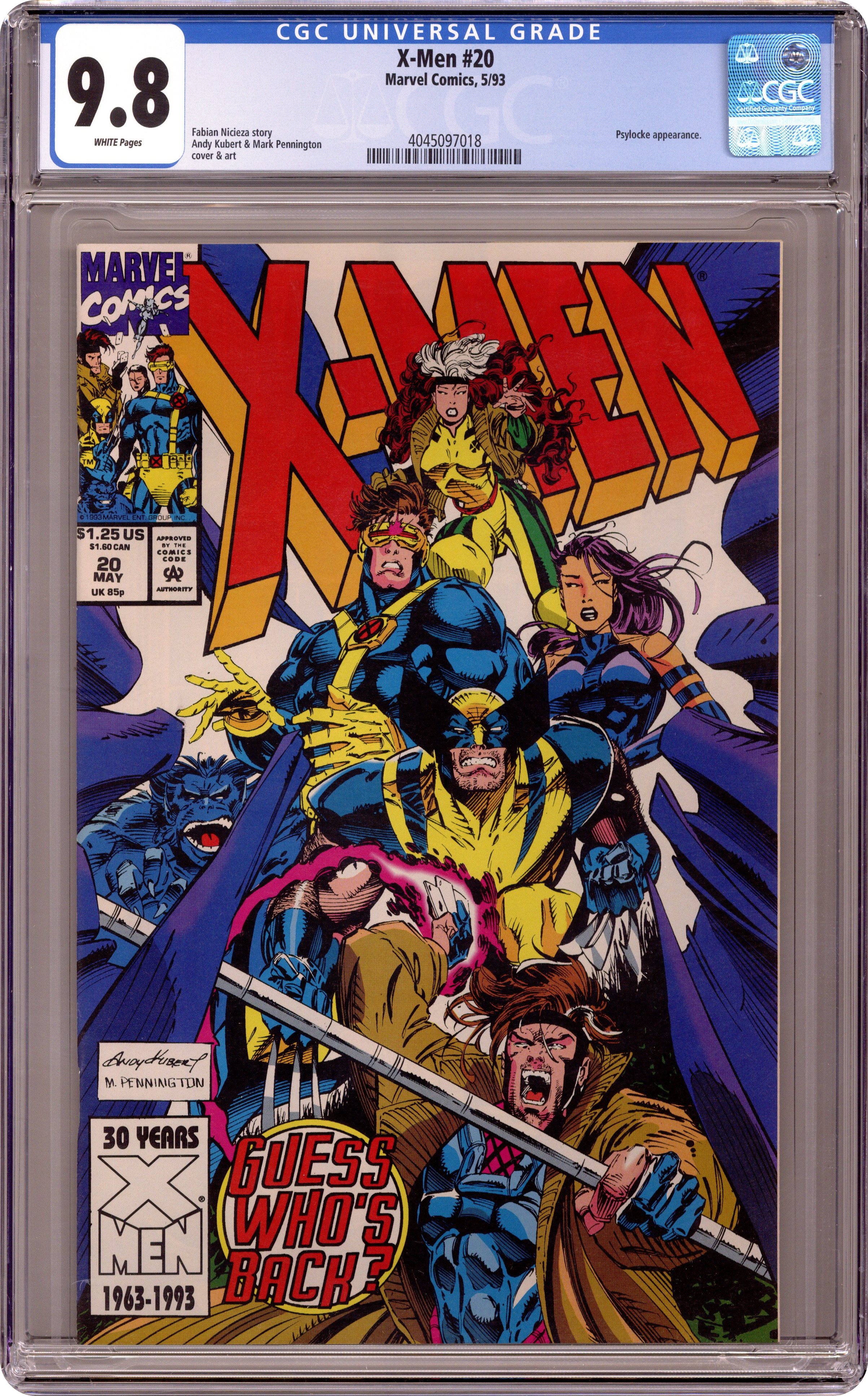 Cover pencils by Andy Kubert, inks by Mark Pennington. Digging in the Dirt, script by Fabian Nicieza, pencils by Andy Kubert, inks by Mark Pennington and Bob Wiacek; The X-Men return from Russia and try to get on with their lives after the death of Peter's parents; A second Betsy shows up to confront Psylocke. 36 pgs. $1.25. Cover price $1.25. Grade: CGC 9.8 explanation of grade Condition: Used (collectible)