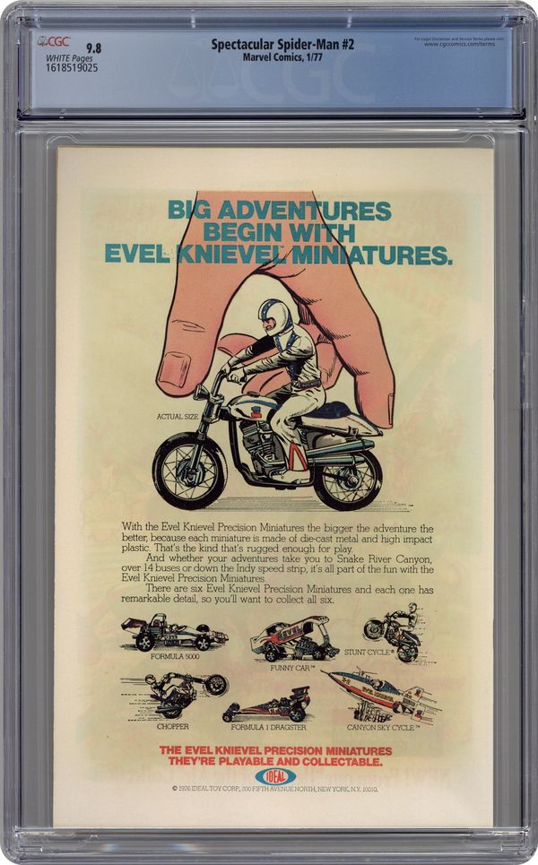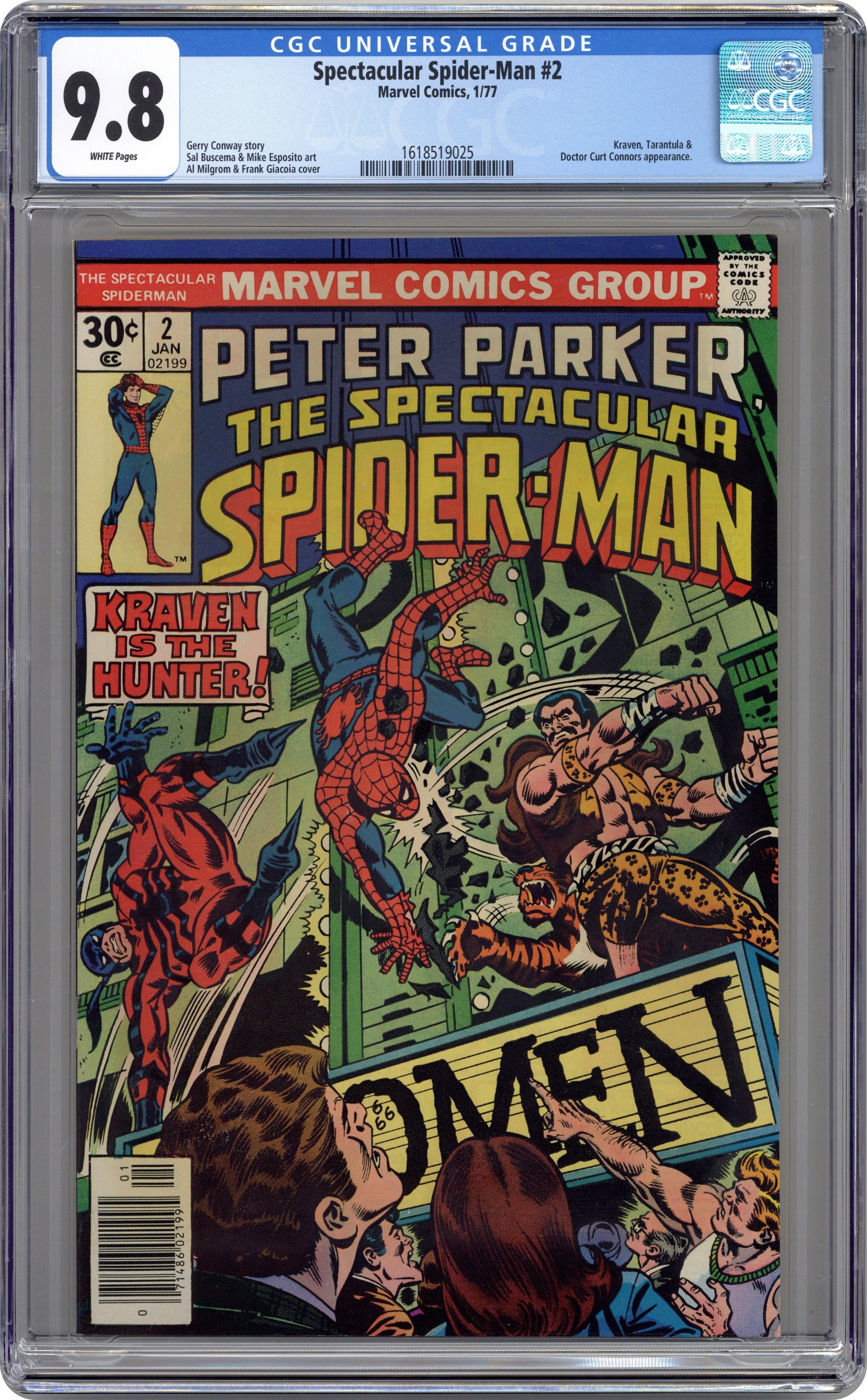 "Kraven Is The Hunter!" Part 2 of 3. Script by Gerry Conway. Pencils by Sal Buscema. Inks by Mike Esposito. Cover by Al Milgrom and Frank Giacoia. Kraven and the Tarantula team up to kidnap the Empire State University chancellor. When Peter Parker hears about the abduction, the web-slinger rushes to ESU to investigate, but the hunter is lying in wait! Kraven and the Spectacular Spider-Man battle from Central Park to the top of a movie theater marquee! And there the wall-crawler will come eye-to-eye with Kraven...and his sharp hunting knife! Meanwhile at the Daily Bugle, J. Jonah Jameson hires Glory Grant to be his new secretary. Cameo appearances by Dr. Curt Connors and Edward Lansky. The Hulk stars in a one-page Hostess ad, "The Green Thumb." (Note: The letters page features an essay from Gerry Conway.) 32 pages Cover price $0.30. Grade: CGC 9.8 explanation of grade Condition: Used (collectible)