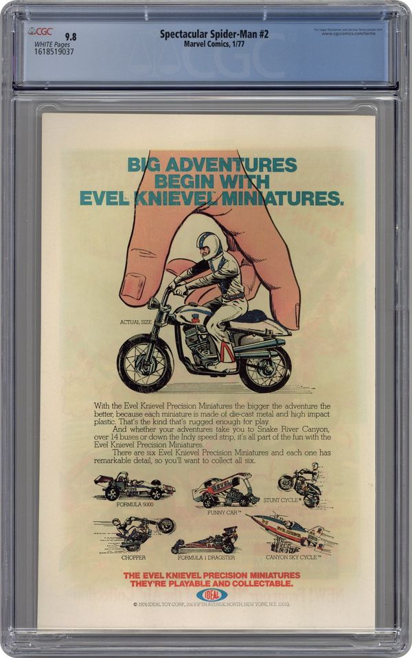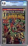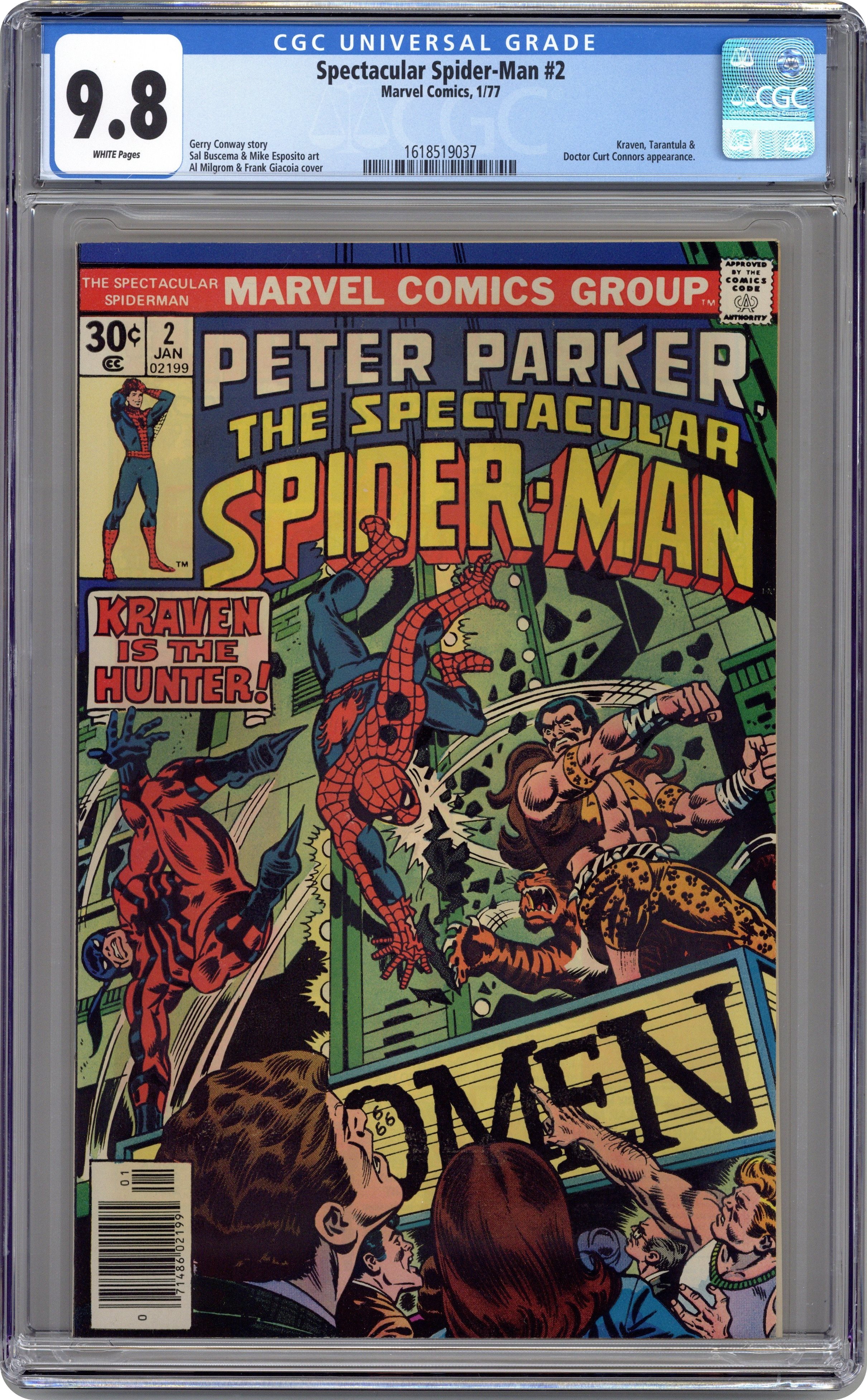 "Kraven Is The Hunter!" Part 2 of 3. Script by Gerry Conway. Pencils by Sal Buscema. Inks by Mike Esposito. Cover by Al Milgrom and Frank Giacoia. Kraven and the Tarantula team up to kidnap the Empire State University chancellor. When Peter Parker hears about the abduction, the web-slinger rushes to ESU to investigate, but the hunter is lying in wait! Kraven and the Spectacular Spider-Man battle from Central Park to the top of a movie theater marquee! And there the wall-crawler will come eye-to-eye with Kraven...and his sharp hunting knife! Meanwhile at the Daily Bugle, J. Jonah Jameson hires Glory Grant to be his new secretary. Cameo appearances by Dr. Curt Connors and Edward Lansky. The Hulk stars in a one-page Hostess ad, "The Green Thumb." (Note: The letters page features an essay from Gerry Conway.) 32 pages Cover price $0.30. Grade: CGC 9.8 explanation of grade Condition: Used (collectible)