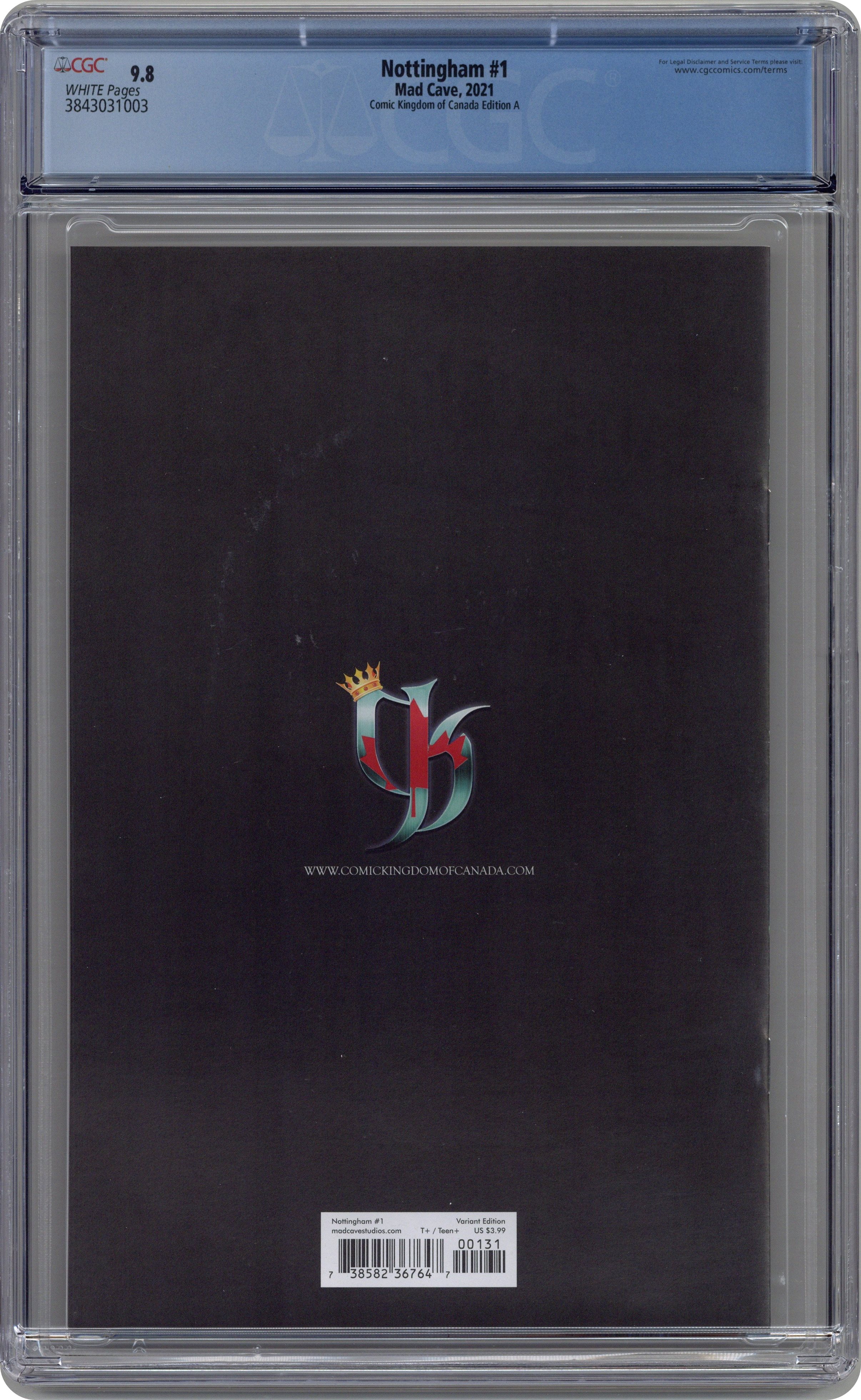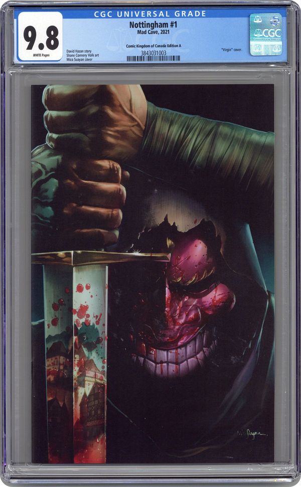 Comic Kingdom of Canada exclusive cover by Mico Suayan. Written by David Hazan. Art by Shane Connery. Volk, Luca Romano In this twisted medieval noir, the Sheriff of Nottingham hunts a serial killer with a penchant for tax collectors. The Sheriff's investigation makes him the target of England's most nefarious power-brokers. That's to say nothing of the Merry Men, terrorists lurking amongst the trees of Sherwood, led by an enigma known only as 'Hood.' 28 pages, full color. Rated T+ Grade: CGC 9.8 explanation of grade Condition: Used (collectible)