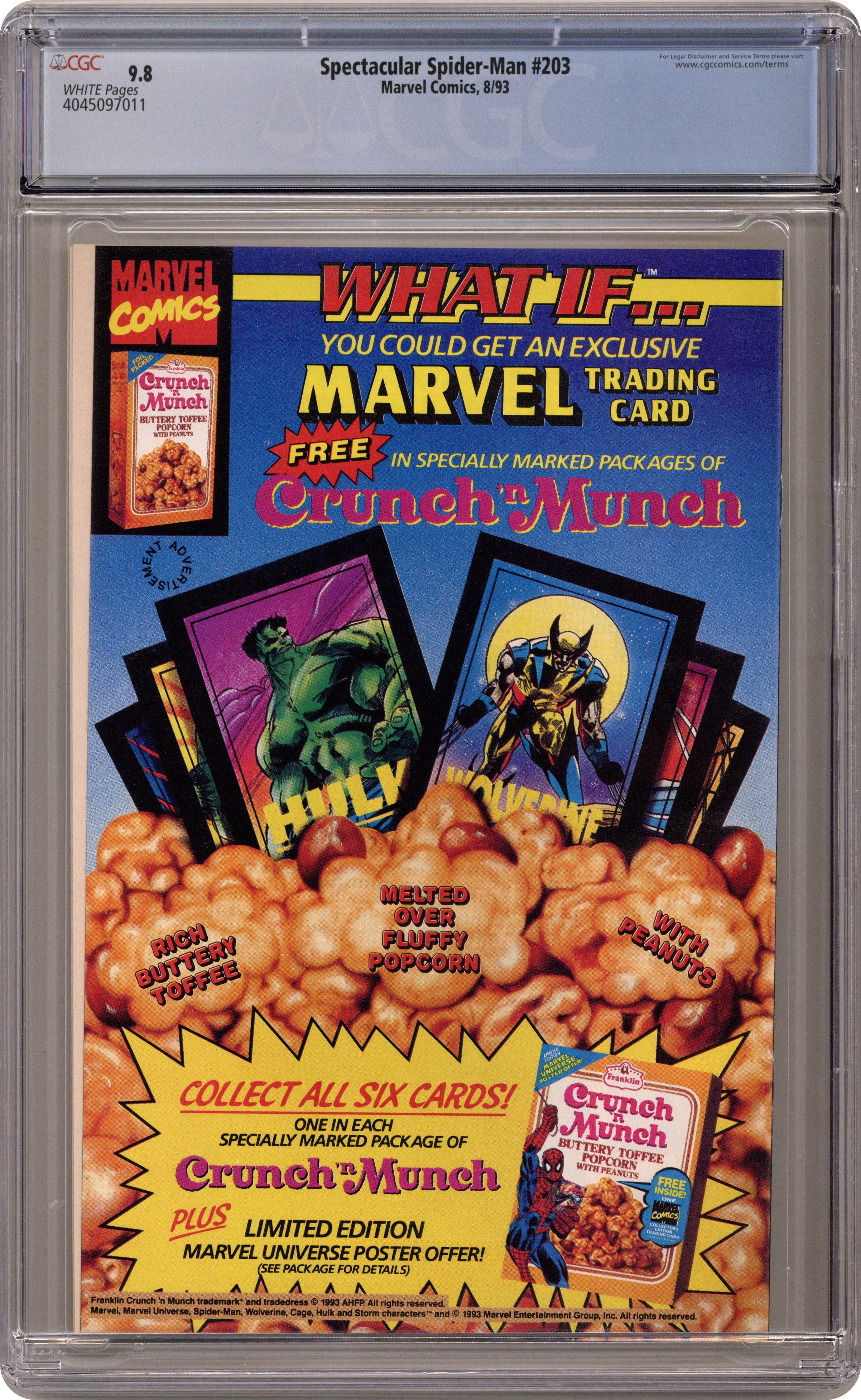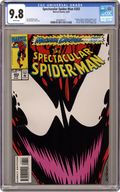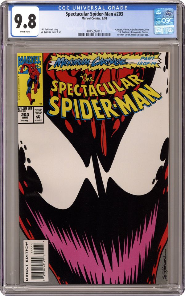 Direct Edition. "War of the Heart!" Maximum Carnage Part 13 of 14. Guest-starring Captain America, Cloak, Dagger, Deathlok, Firestar, and Iron Fist. Script by J.M. DeMatteis. Pencils and Inks by Sal Buscema. Cover by Sal Buscema. In dazzling fashion Dagger reappears at Cloak's side! And quickly lashes out at her almost-murderer Shriek! After the web-slinger swoops in and saves Dagger, he sends Cap and his other partners to the nearby Rand Corporation to retrieve a special weapon! In the meantime the Spectacular Spider-Man has to stay alive against Carnage, Shriek, Carrion, and the Demogoblin before his friends return! Can the wondrous wall-crawler hold the line one more time against Carnage and his crew? And will the secret weapon finally, finally bring down the curtain on Maximum Carnage? Story concludes in Spider-Man Unlimited 2. Cameo appearance by Venom. (Notes: Shriek appears next in Web of Spider-Man Annual 10. The letters page includes fan letters suggesting that fourteen issues may have been a few too many for the Maximum Carnage storyline.) 32 pages Cover price $1.25. Grade: CGC 9.8 explanation of grade Condition: Used (collectible)