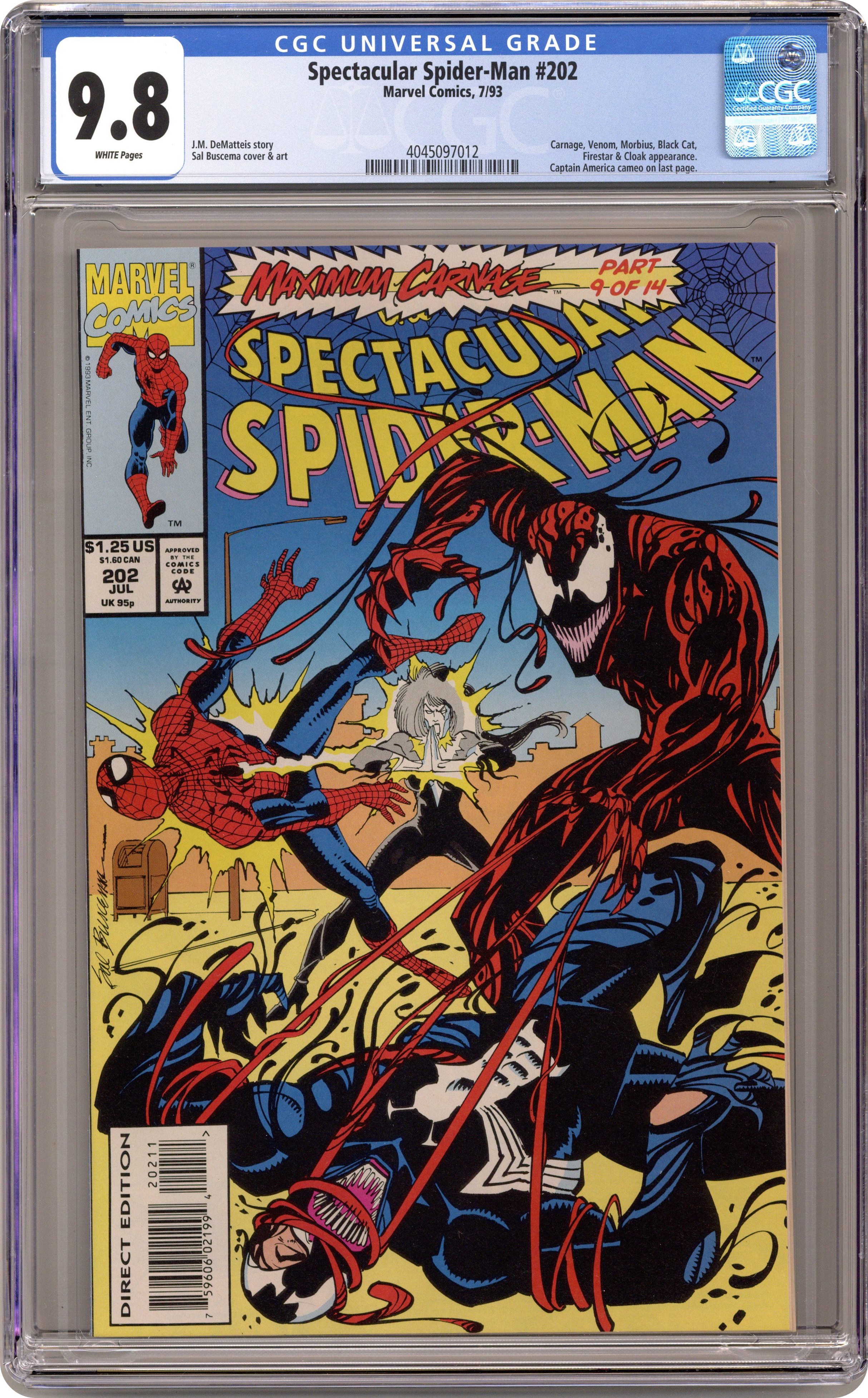 Direct Edition. "The Turning Point!" Maximum Carnage Part 9 of 14. Guest-starring Cloak and Firestar. Script by J.M. DeMatteis. Pencils and Inks by Sal Buscema. Cover by Sal Buscema. Story continues from Spider-Man 36. To the utter shock and dismay of Spider-Man and his friends, Reed Richards' sonic gun has no effect on Carnage! The weapon (that the good guys were counting on) has failed to stop the serial killer! And now in the woods, the next savage battle erupts! The web-slinger, Black Cat, Cloak, Firestar, Morbius, and Venom vs. Carnage, Shriek, Carrion, the Demogoblin, and the doppelganger! But the momentum has shifted to the side of evil. Cloak is the first to fall and then Felicia. After Morbius goes down, the only option left…kill Carnage with Firestar's flame blasts! If this strategy fails as well, then the chances of victory are between slim and none. And Carnage already killed slim several issues ago! Story continues in Web of Spider-Man 103. Cameo appearance by Captain America. 32 pages Cover price $1.25. Grade: CGC 9.8 explanation of grade Condition: Used (collectible)