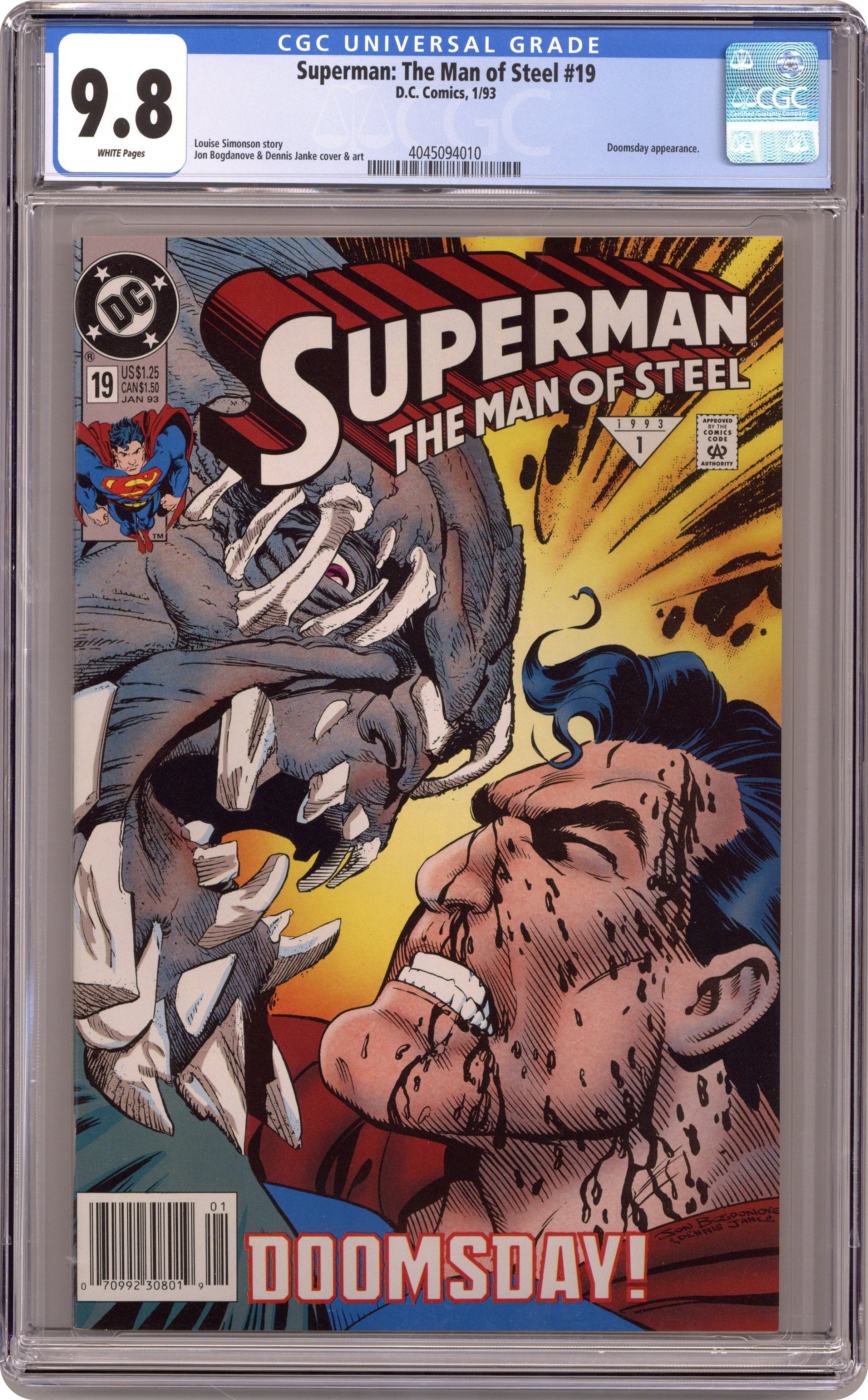 First Printing. Direct Edition. Written by Louise Simonson, with art and cover by Jon Bogdanove and Dennis Janke. Part 6 of the critical 7-part series 'Doomsday' that leads to a pivotal event in the life of the Man of Steel, continued from Action Comics (1938 DC) #684. The fight to the death intensifies as Doomsday and Superman hit Metropolis - hard! Concludes in Superman (1987) #75. Cover price $1.25. Grade: CGC 9.8 explanation of grade Condition: Used (collectible)