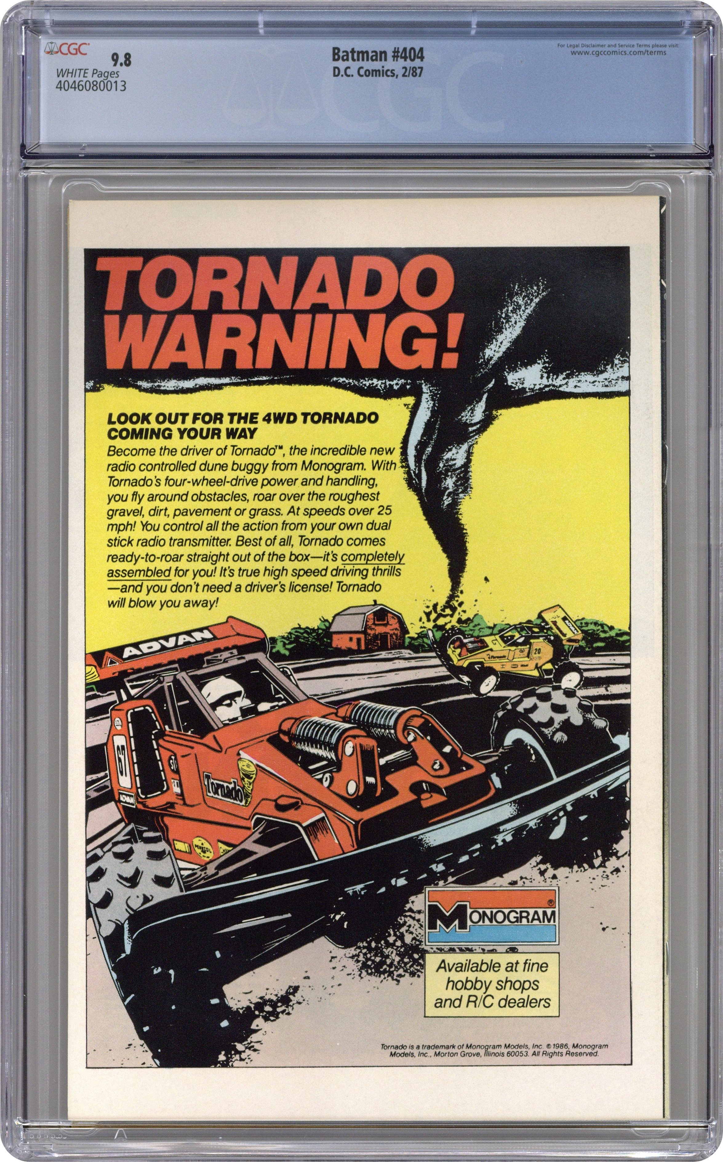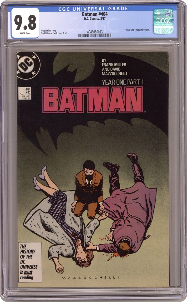 First Printing. Direct Edition. Batman Year One, Chapter One: "Who I Am, How I Came To Be".Part 1 of 4, continued next issue. A 25-year-old Bruce Wayne returns to Gotham after 12 years abroad, while Lieutenant James Gordon joins the Gotham police force. Script by Frank Miller, art by David Mazzucchelli. Selina Kyle appearance. Mazzucchelli cover. 1st printing. NOTE: Most issues from 397-432 were reprinted in 1989 and sold in multipacks. These 2nd and 3rd prints have back cover ads dated 1989. 36 Pages, Full Color. Cover price $0.75. Grade: CGC 9.8 explanation of grade Condition: Used (collectible)